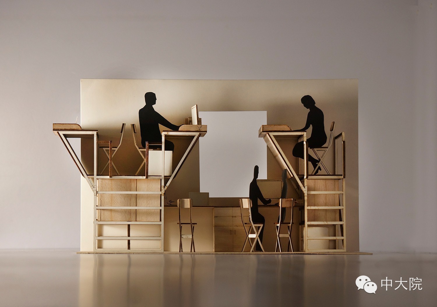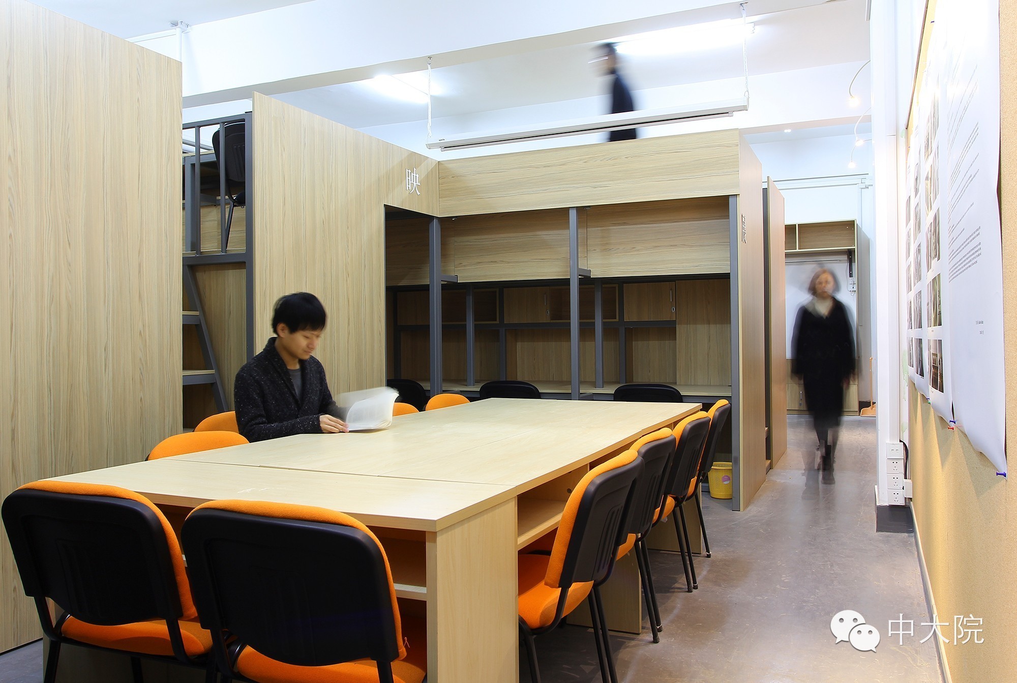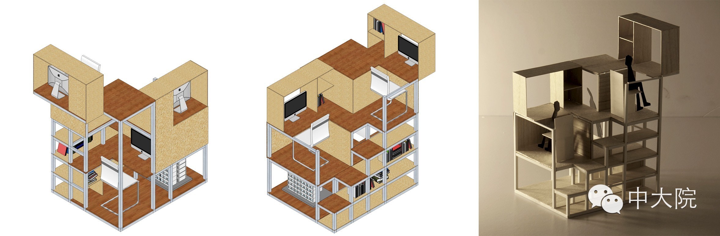 每一次的设计与建造过程就是一次从猜想到验证的过程。我最深的体会就是,材料的重量感,体积感,空间感,是在用软件绘图时是感觉不到的。本次设计的特别之处在于,因用地条件和工位数量的要求,会出现一些反常规尺度,例如,楼梯的尺度 不能是宽高是300和150;会出现在空间上有所叠加的两层工位。难点在于如何将其转化为能正常使用的舒适空间。另外,还要适合建筑设计教学的特点:小组合作加集体评图需要集中大空间,同时需要更多的储藏空间和大桌面板等等。所以,在设计初期所研究的人体尺度,模度应该紧密结合具体的设计构思,而不是盲目把模度作为出发点去生成形式上很“丰富”的东西。最后的成果整体比预期的好,主要体现在尺度上,现场的空间感显得比su模型查看时更大,特别是二层工位和一层的共享空间,不显得拥挤。但也有缺憾,如一层工位在现场体验时仍有可能出现碰头的情况,楼梯踏步比预期要陡,自然采光不是很理想。在建造过程中,最值得思考的就是,图纸如何去控制施工。以前总认为建筑师画构造图需要很细地画到每一个螺丝钉,去控制现场的一切。这其实是有危险性的,如果这样做,则绘图者有非常丰富的实践经验,要以建造者的身份去想象现场的每一个细节。实际上更为重要的是要对各个工种的能力有所了解,对节点工艺的整体把握。最后总结一句,方案的深化很重要,因为它决定了设计最后的品质。