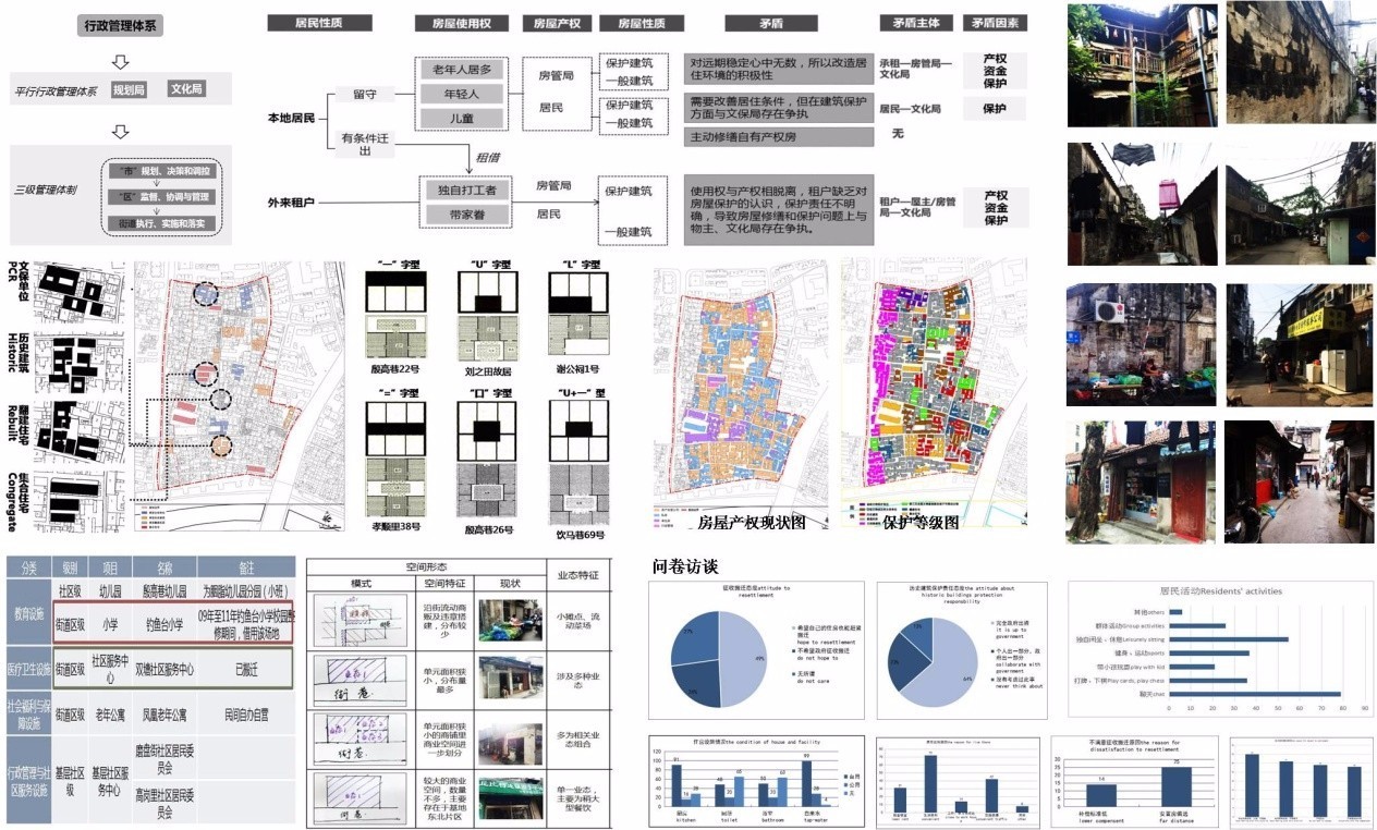 同学们通过实地踏勘、深入访谈及发放问卷等方式,得到比较详尽的基础资料。调研围绕住房、交通、公共设施、开放空间四个方面展开,就各类建筑的所有权及使用权归属问题进行深入探究,并分析社区管理体系、社会经济情况,总结现状问题,探究问题成因,找寻发展潜力。