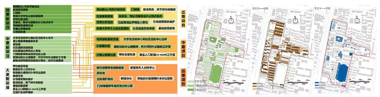 该设计以合作共享为发展理念,着力于营造具有活力的、与城市融合的知识型开放社区。设立大、中、微更新项目库,分近、中、远期以及不同责任主体执行,灵活有序地引导社区发展。
