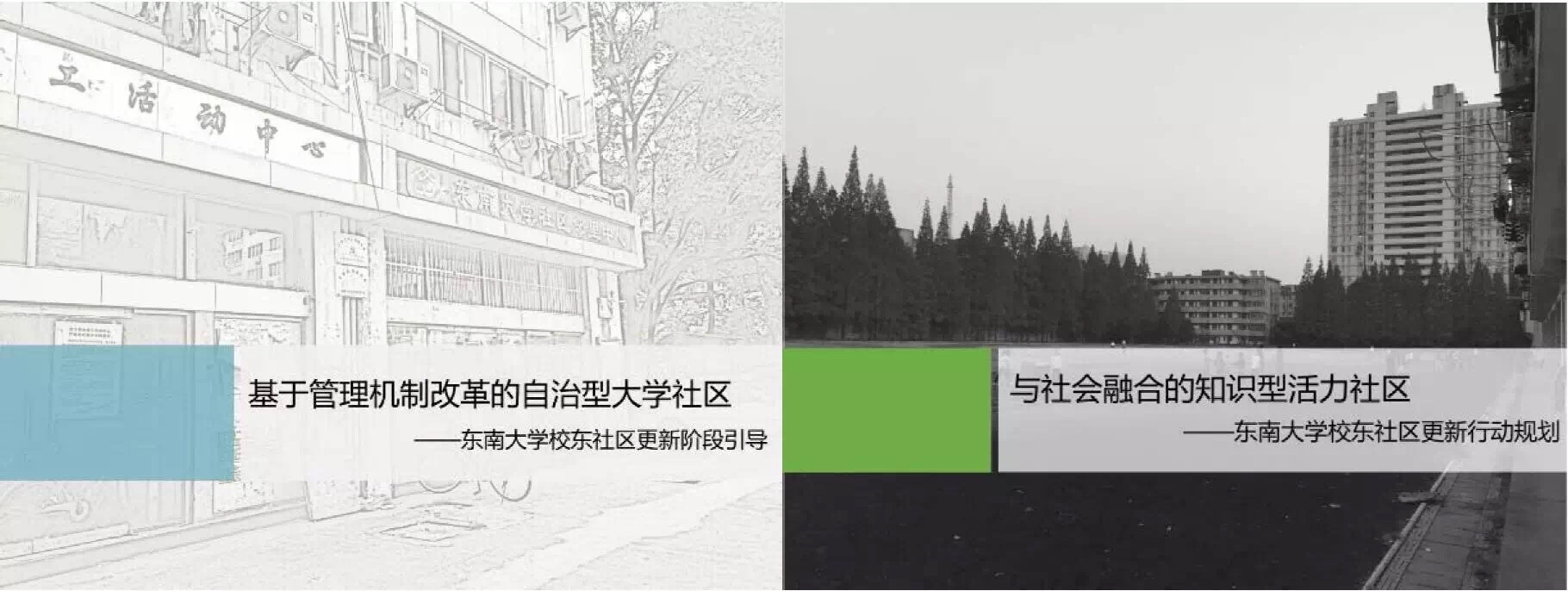 东南大学校东社区的混乱现状与其大学社区的特点、绝好的城市区位不相匹配,与其社会化转型过程中责权模糊、历史遗留问题难以解决、福利房私有化过程中公共资本积累少、住房市场化过程中外来人口进入、缺乏契约和管理乏力形成恶性循环等多种原因相关。同学们认为东大校东社区具有向知识型活力社区发展的优秀潜质,但是其发展方向依赖于关键主体意识转型以及运营机制转型,依赖于新的多元化资本积累,才能由相应主体择机推进各类更新项目。同学们提出了两套策略提案: