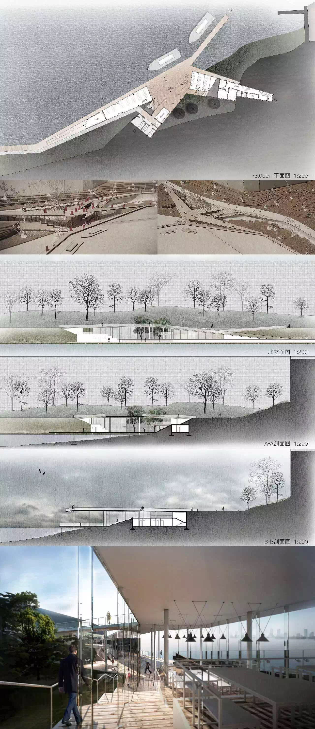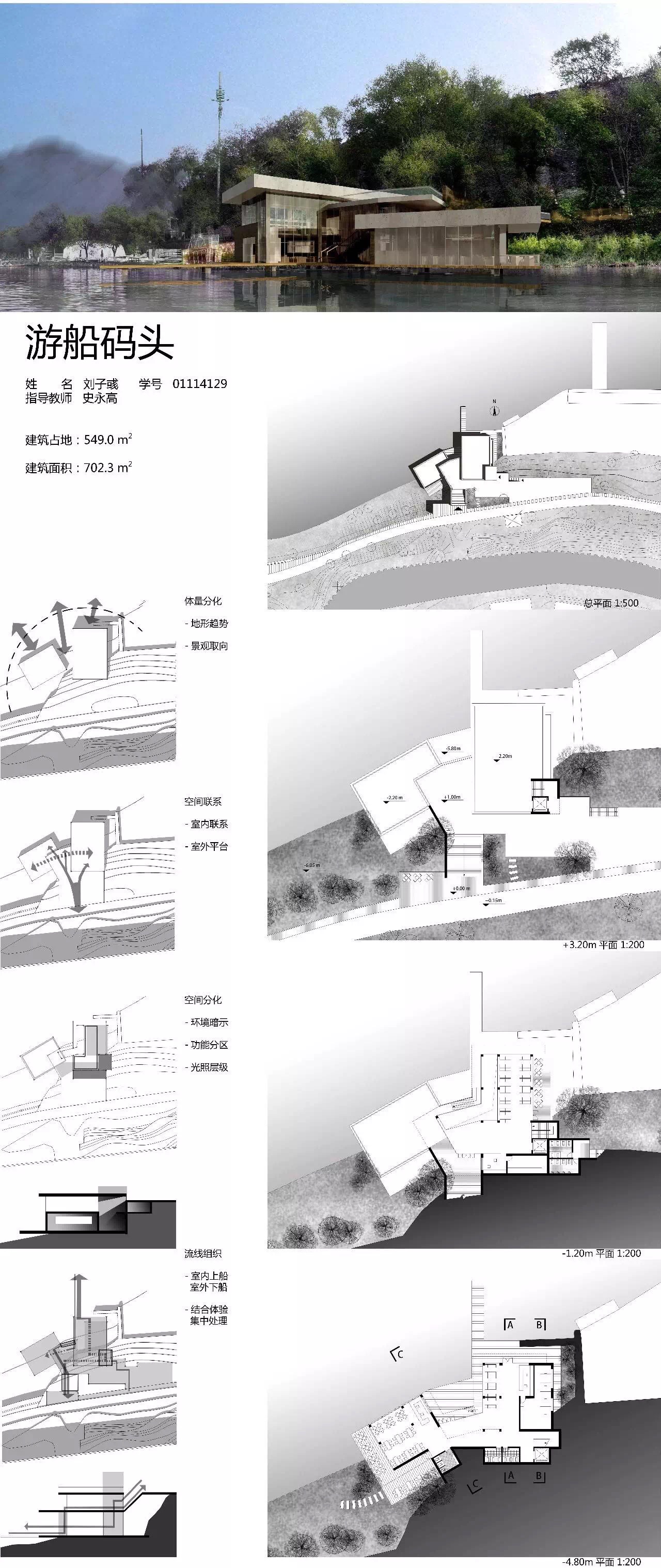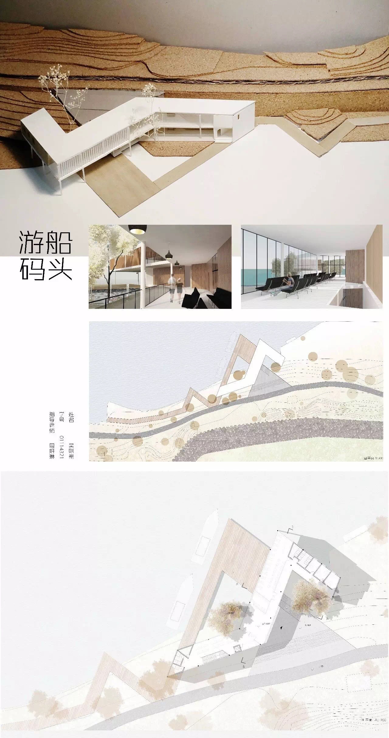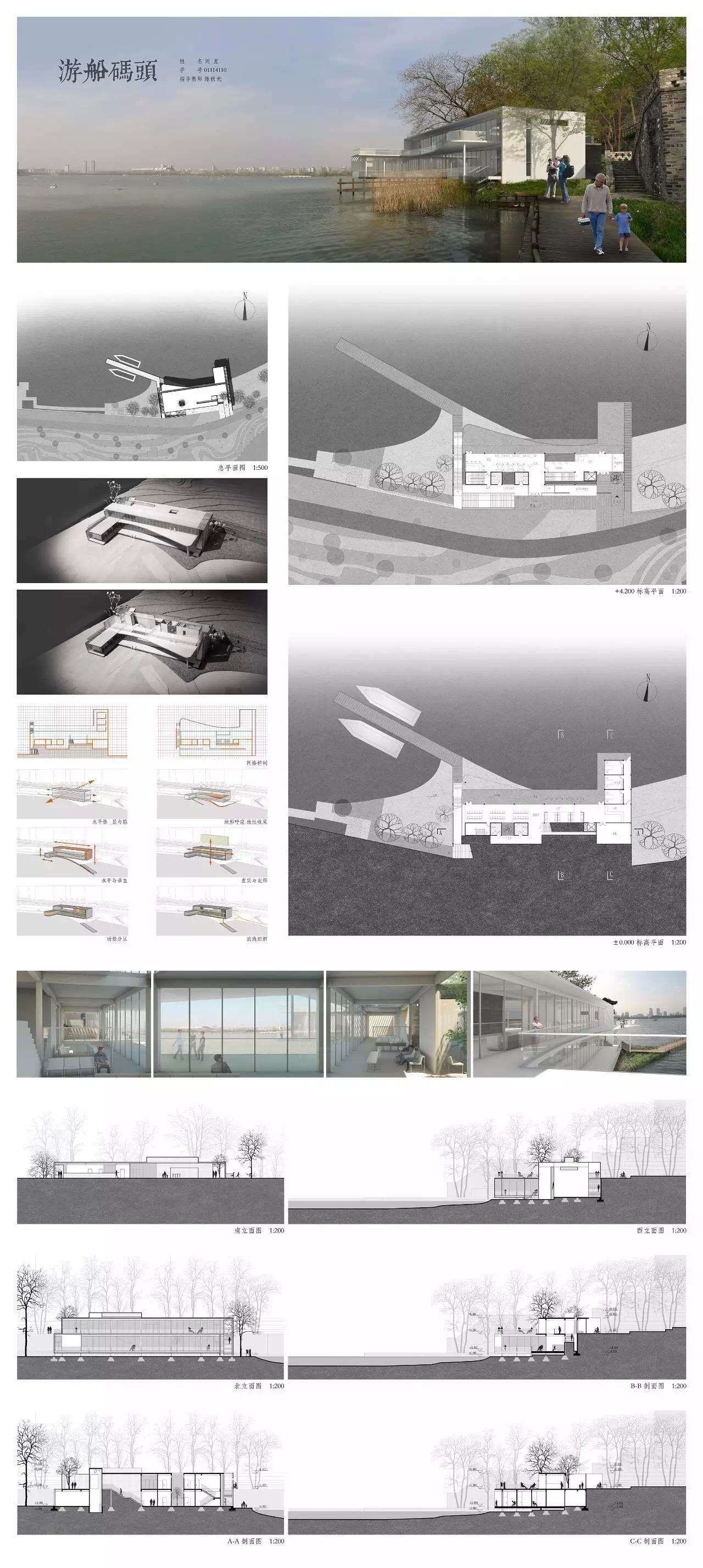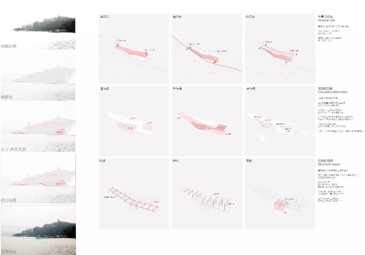 整体功能要求分为建筑与场地两个部分,其中,建筑部分包括主体功能与流线、附加公共设施以及配套服务,总面积不大于800m2,场地部分要求要与建筑相对应的场地入口、码头入口、停船栈道、码头(同时停靠2艘40-50人左右的游船)、自行车停放等。总体而言,建筑在满足景观建筑要求的基础上,需满足不同流线的行为要求,并利用高差,形成不同的空间体验。