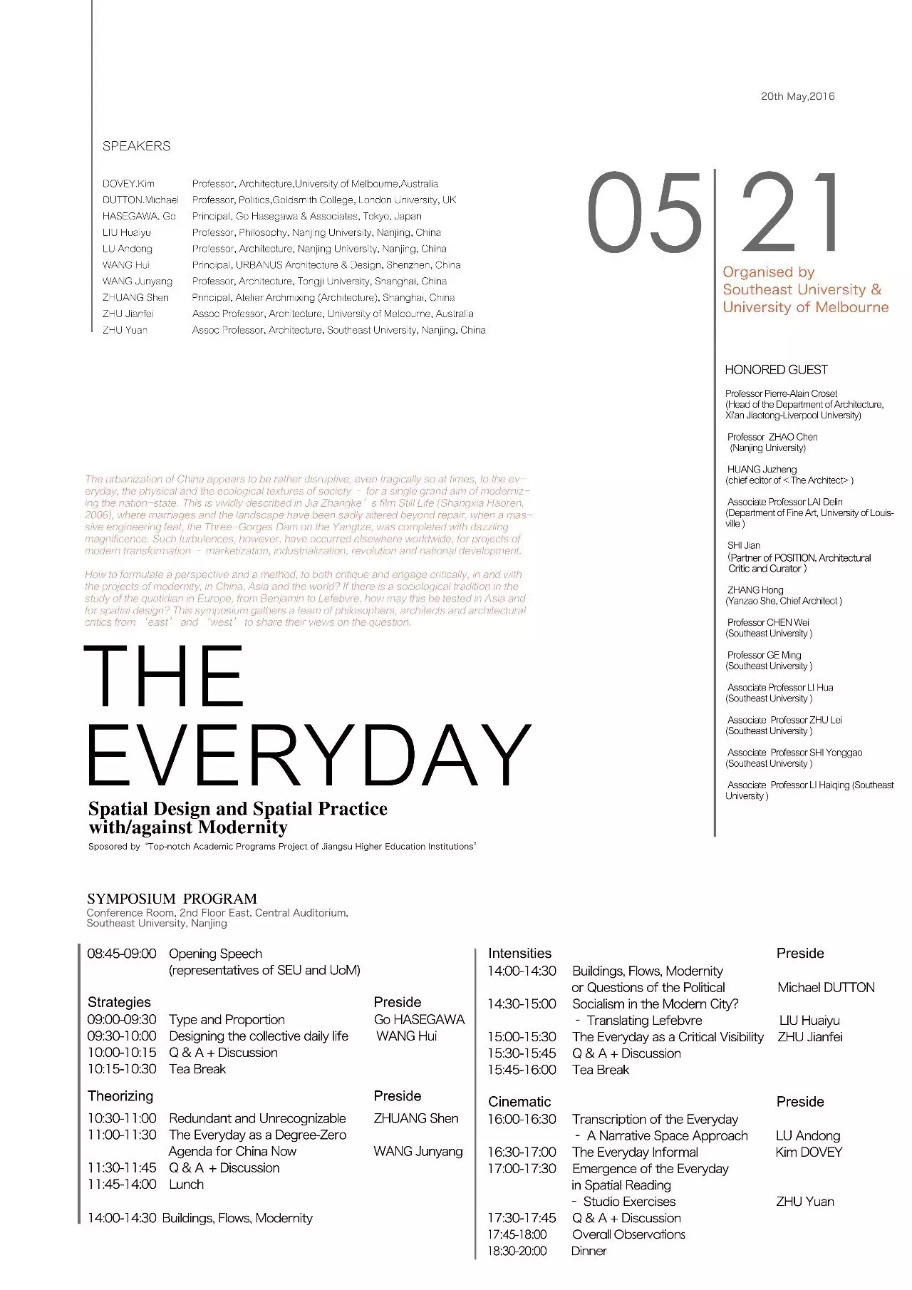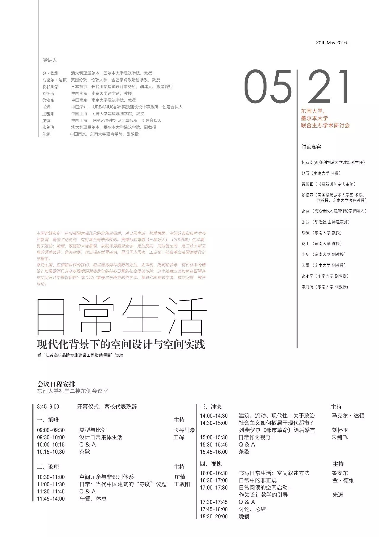 身处中国、亚洲和世界的我们,应当建构何种视野和方法,去审视、批判和参与,现代体系的建设?如果欧洲已有从本雅明到列斐伏尔的关心日常的社会理论传统,这个线索应当如何在亚洲并在空间设计中得以检验?本会议召集来自东西方的哲学家、建筑师和建筑学者,就此问题,展开讨论。