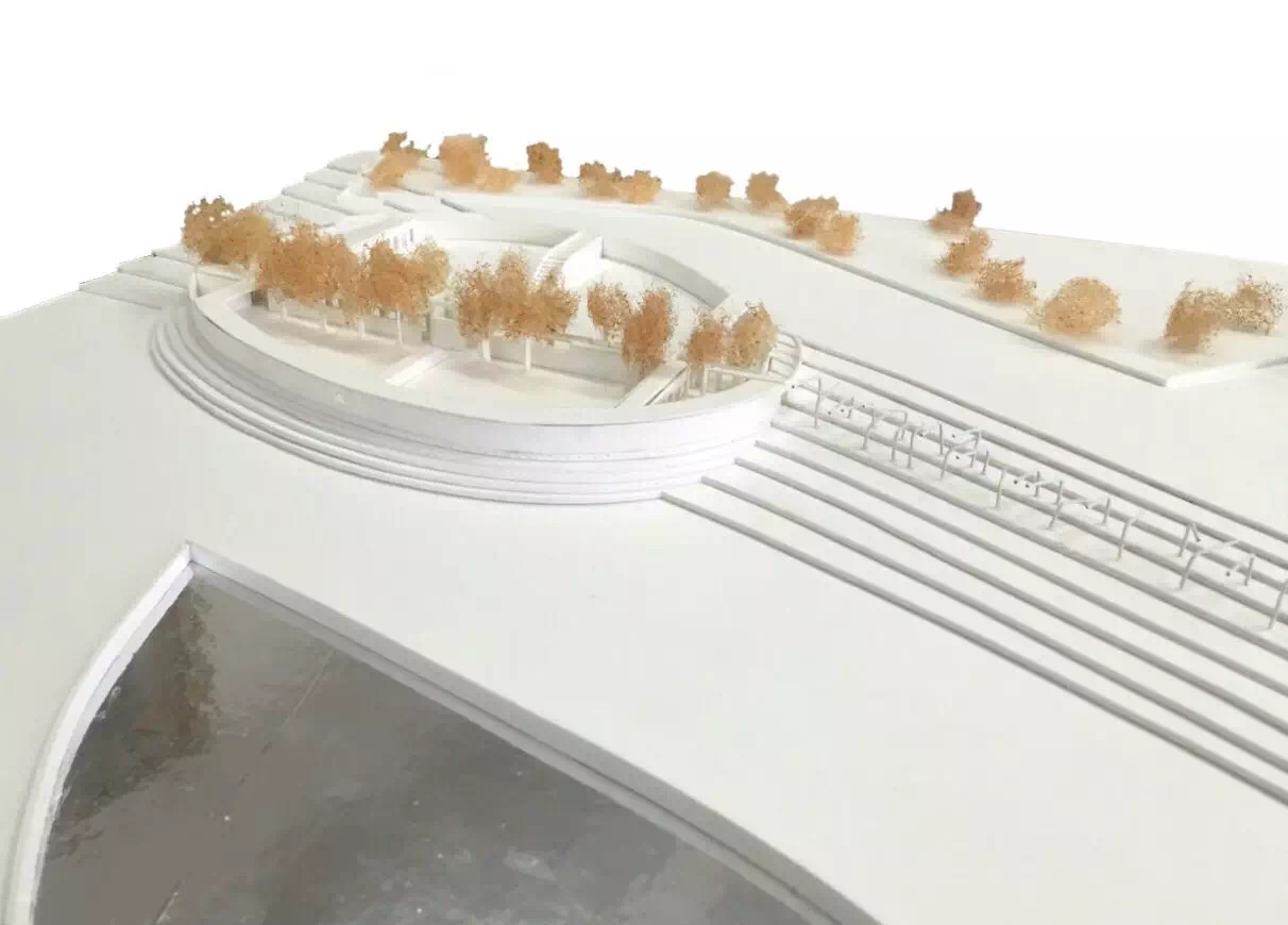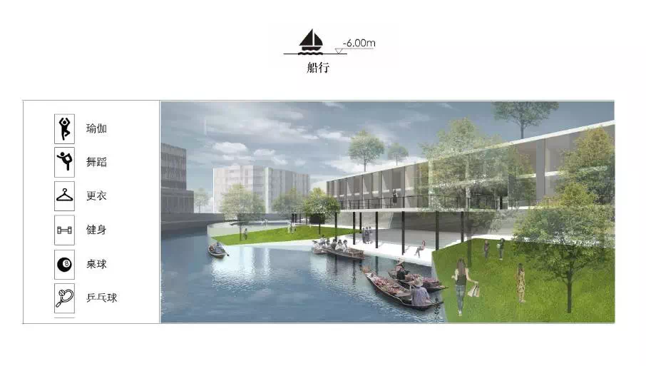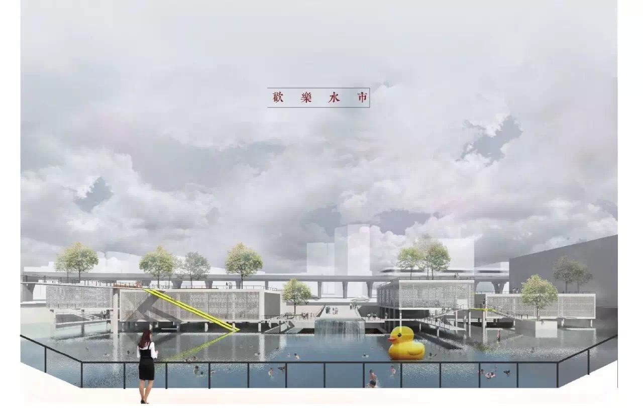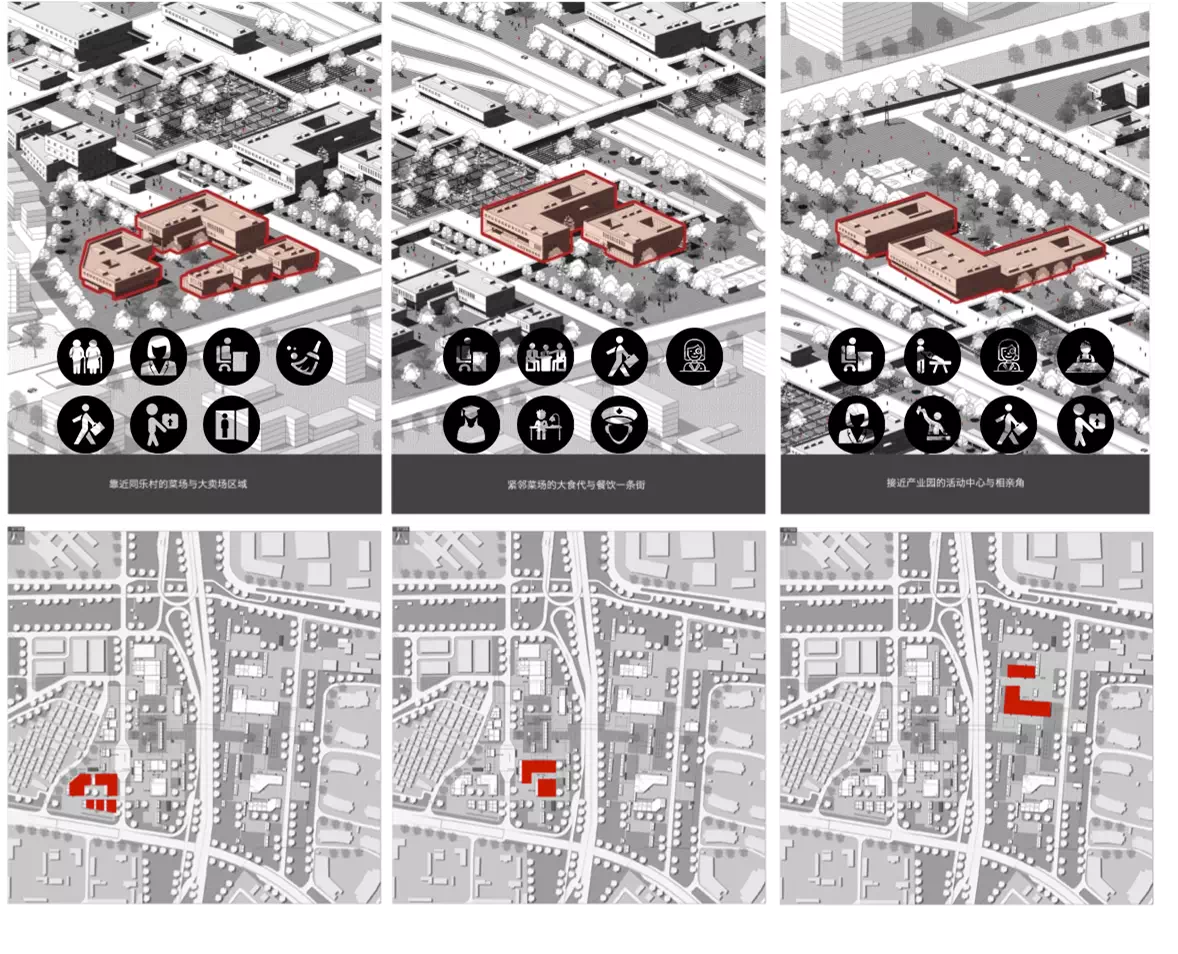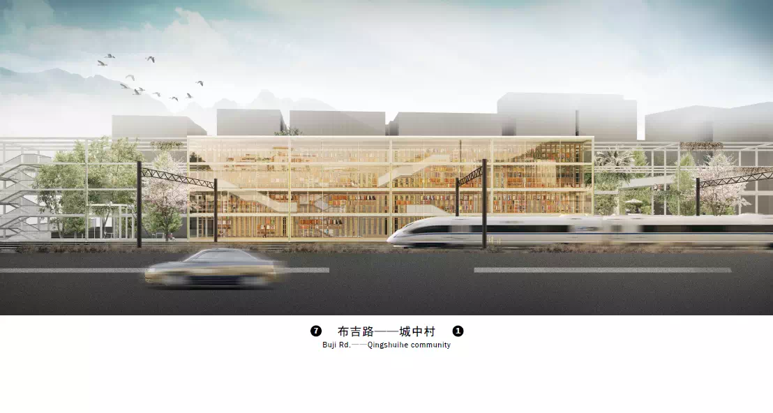 单体建筑设计选择不同类型节点展开。“水市牌坊”从挖掘场地记忆出发探索传统意象的当代表达,在城、村交接的重要节点营造了具有精神内涵的全新建筑;“速度市井”从激发铁道旁较为消极的线性空间活力出发,以不同速度感知为题创造了展现快慢、大小等二元性的双面城市空间;“欢乐水市”营造了容纳体育活动的开放门户与开敞现代的市民空间;“桥上市集”在高密度环境中融合衣食住行的多元体验创造出具有文化意蕴的新桥上空间。