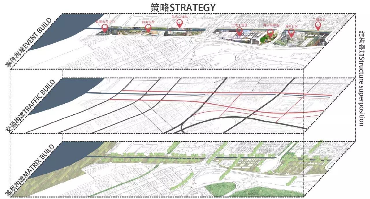 重庆大学南头关设计组的同学们以“二线理想城”为题,设计基于对“两边四界”的城市空间割裂状态的研判,采用渐进式更新策略将南头关作为深圳二线关的文化记忆要素融入到城市发展的动态过程。借助景观都市主义的设计视角,方案将城市的空间割裂问题从区域环境的基质构建,交通构建,事件构建三个层面从底到顶逐层梳理,以时间为维度,叠加形成多层次、多维度、动态更新的城市结构系统,重构了南头关城市生活的历史和当下。