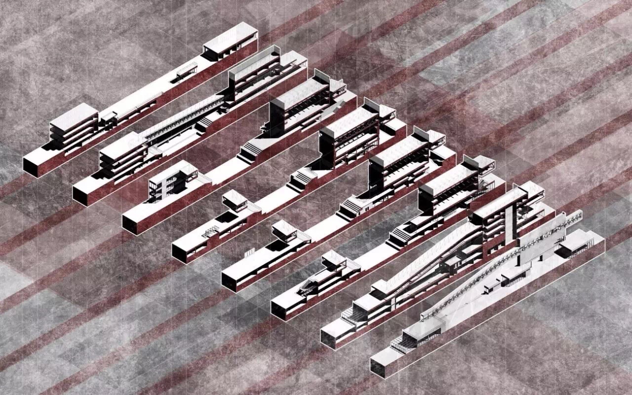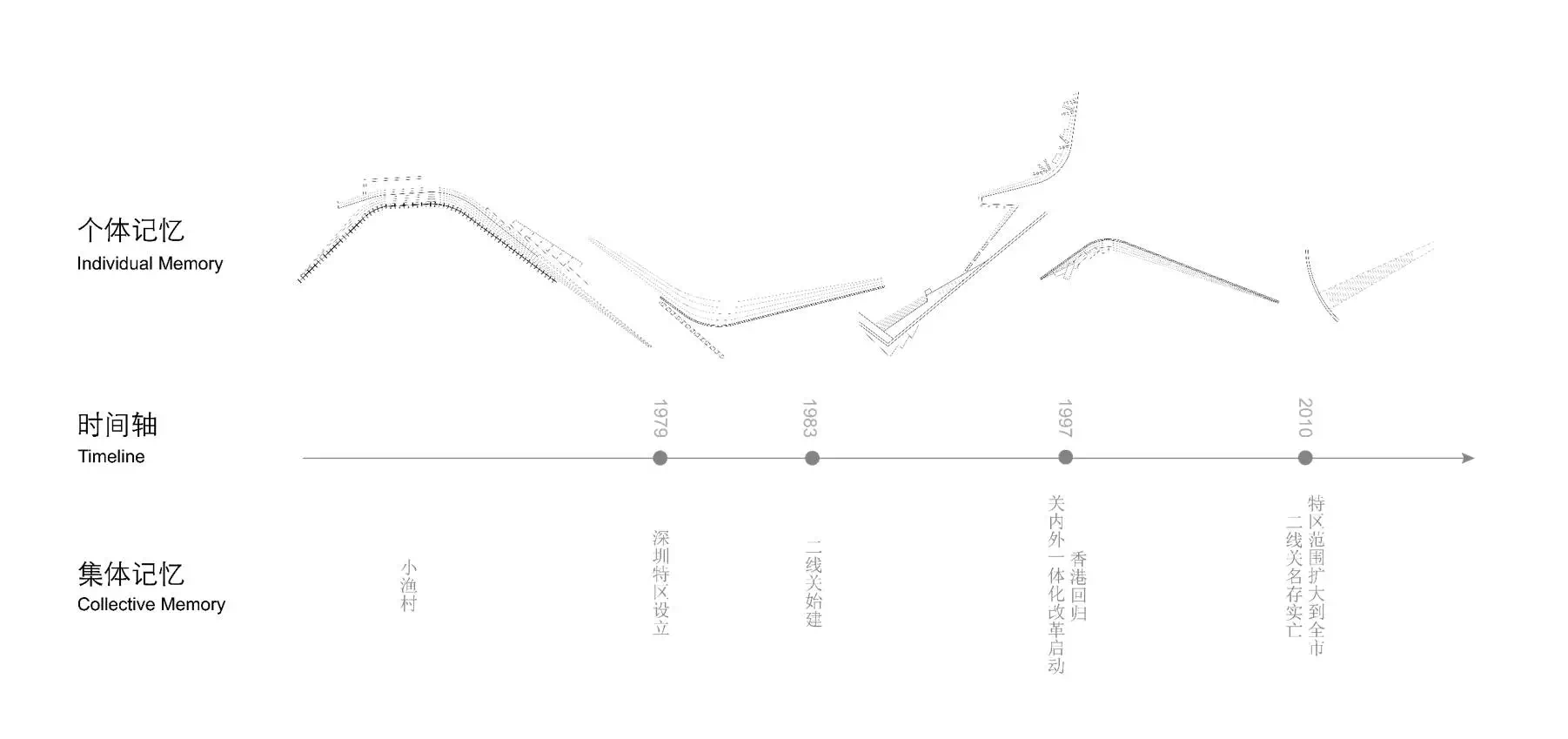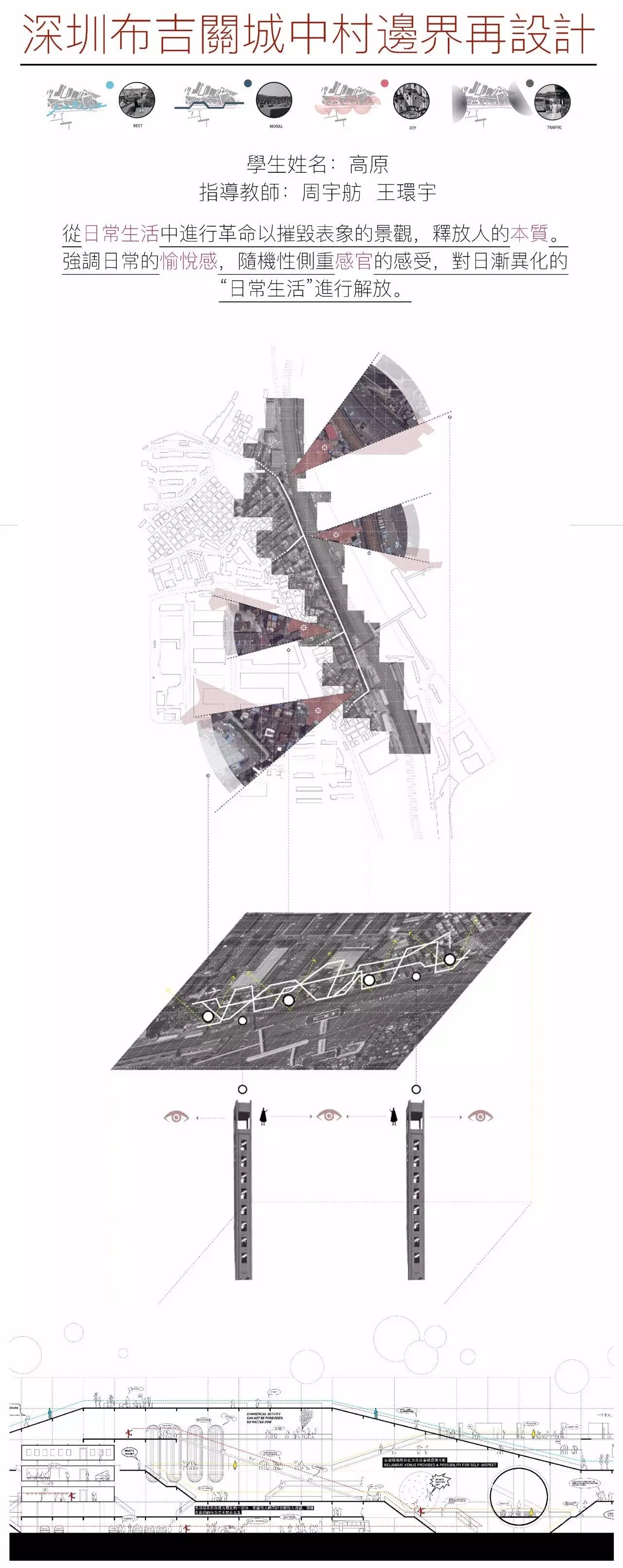 在本次毕业设计中,深圳二线关成为了一个不得不被关注的对象。城中村、无主之地、巨大的空间尺度、拥塞的交通、混乱的地景,当然还有深圳飞速发展的城市空间和同样飞速增长的地价。这一切,让任何一个仅仅经历了4年多建筑设计训练的同学在面对二线关这个题目时,都会显得束手无策。面对二线关这样一个清晰又不那么明确的边界,吕立丰和葛康宁在他们的毕业设计中,将二线关对一代深圳人的影响以一种日常记忆的方式融合在城市空间中。在设计的过程中,两位同学对二线关的历史事件进行了充分的挖掘,提取出可以作为信息载体的记忆提示物,进而对形式类型和建筑类型进行了系列性的研究分析,从而将二线关的记忆、日常的生活和城市中的空间以建筑的方式进行整合,得到了让人信服并为之动容的设计成果。