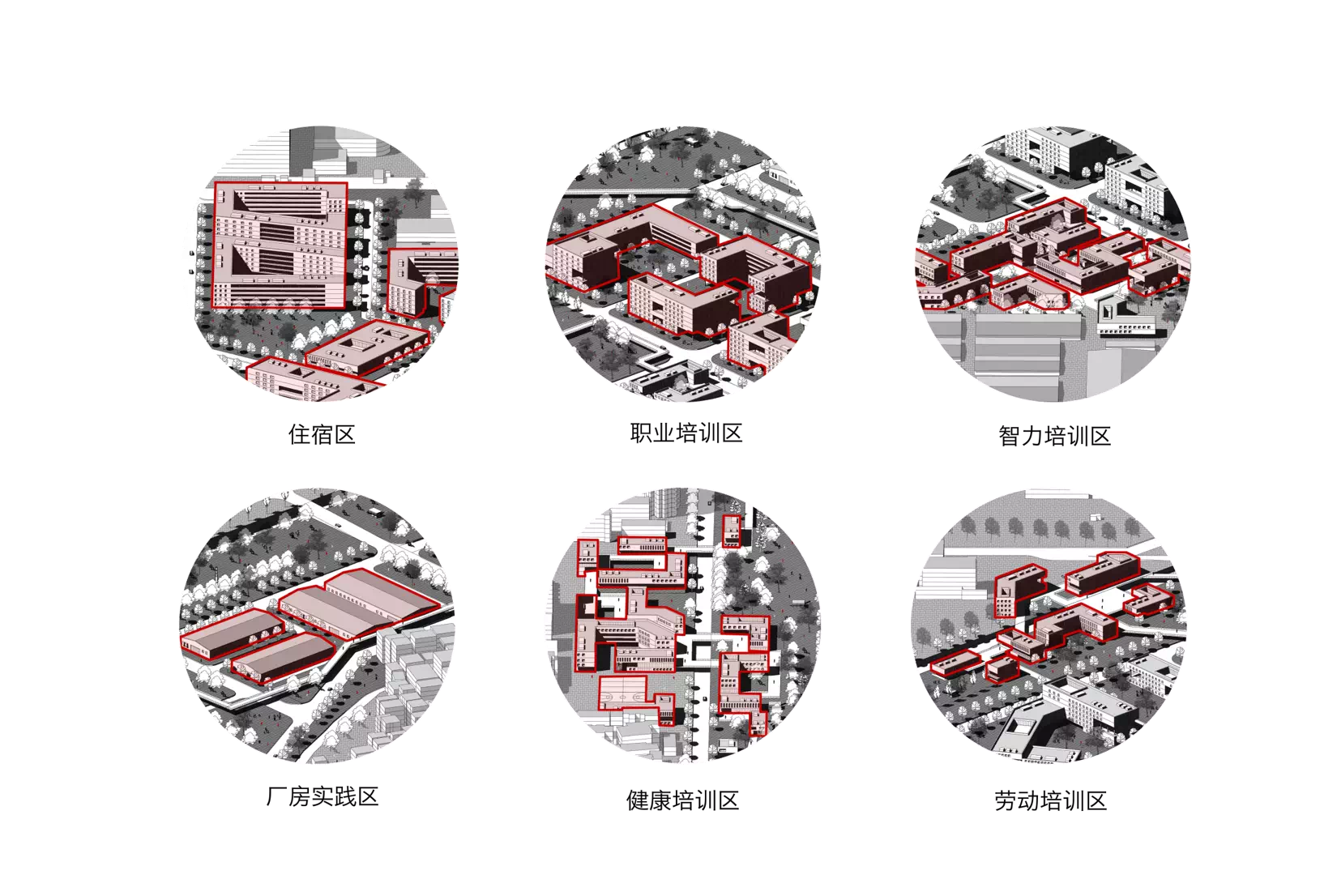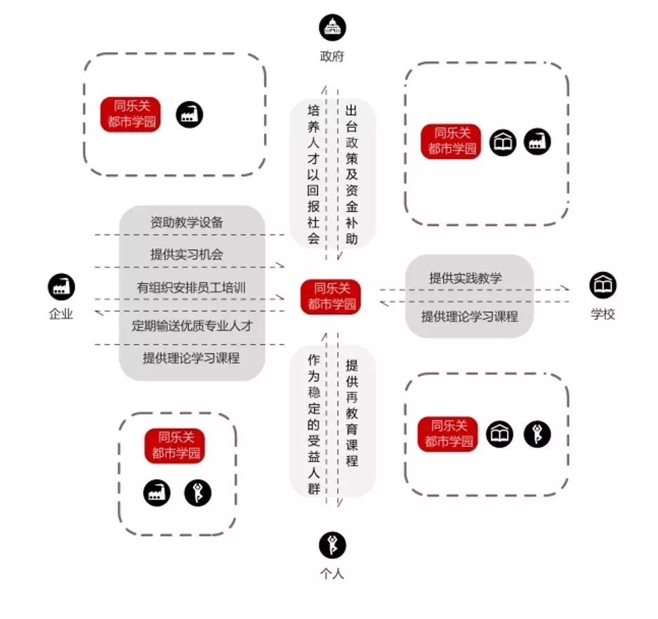 赵曜、朱旭东、姜鸿博所在城市设计小组以同乐关为课题,着重探讨同乐关地区社会结构的重构。他们通过对深圳教育现状的数据分析,比较研究社会继续教育与社会发展的关系,提出了教育全民化的概念,在同乐关地区规划了以社会继续教育为主题的“都市学园”,以期消解同乐关周边社会单元的相互隔离状态。在空间布局中,他们将社区公共空间与社会继续教育空间相结合,规划了多中心、低密度、与周边街区有机对接的同乐关公园建筑群,以期达到深圳二线关沿线结构织补与空间弥合的目标。