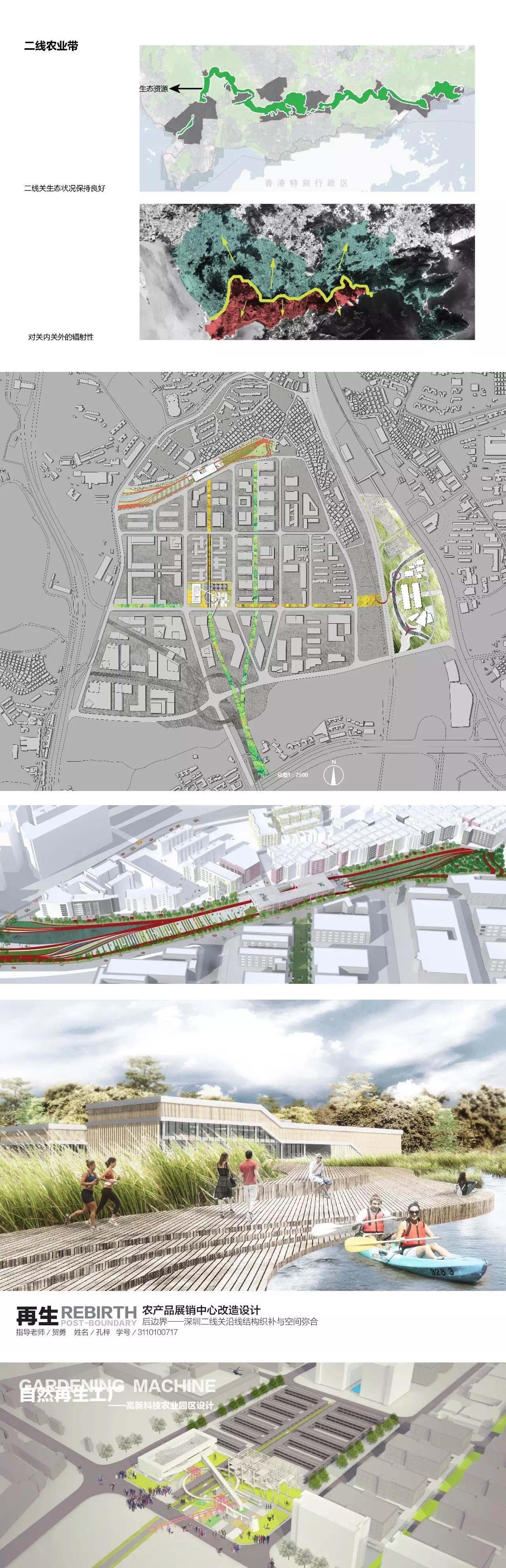 设计题目中的一个关键词是“后边界”,“后”表示着时间上的一个节点,也暗含着未来的一种转向与可能。二线关沿线地区,“后”在何方?在对于布吉关地块详细的调研之后,我们觉得这里最缺的绝不是标志性建筑,而是如何通过设定发展目标与策略,让建筑成为某种“触媒”,催生出更有活力的产业,也同时营造出更为宜居的城市环境。于是该小组同学选择了布吉关的那片仓储物流园区作为基地,从产业转型的角度出发,响应未来都市农业发展的趋势,利用这片使用率低下的仓储物流园区创造了一个高新农业科技与体验园区,服务于深圳以及周边地区。它的出现不仅能够给深圳提供新鲜果蔬和其它安全的有机食物,也能够给布吉城中村居民提供工作机会、活动场所,同时给城市创造新景观,为布吉的未来发展带来新的机遇。