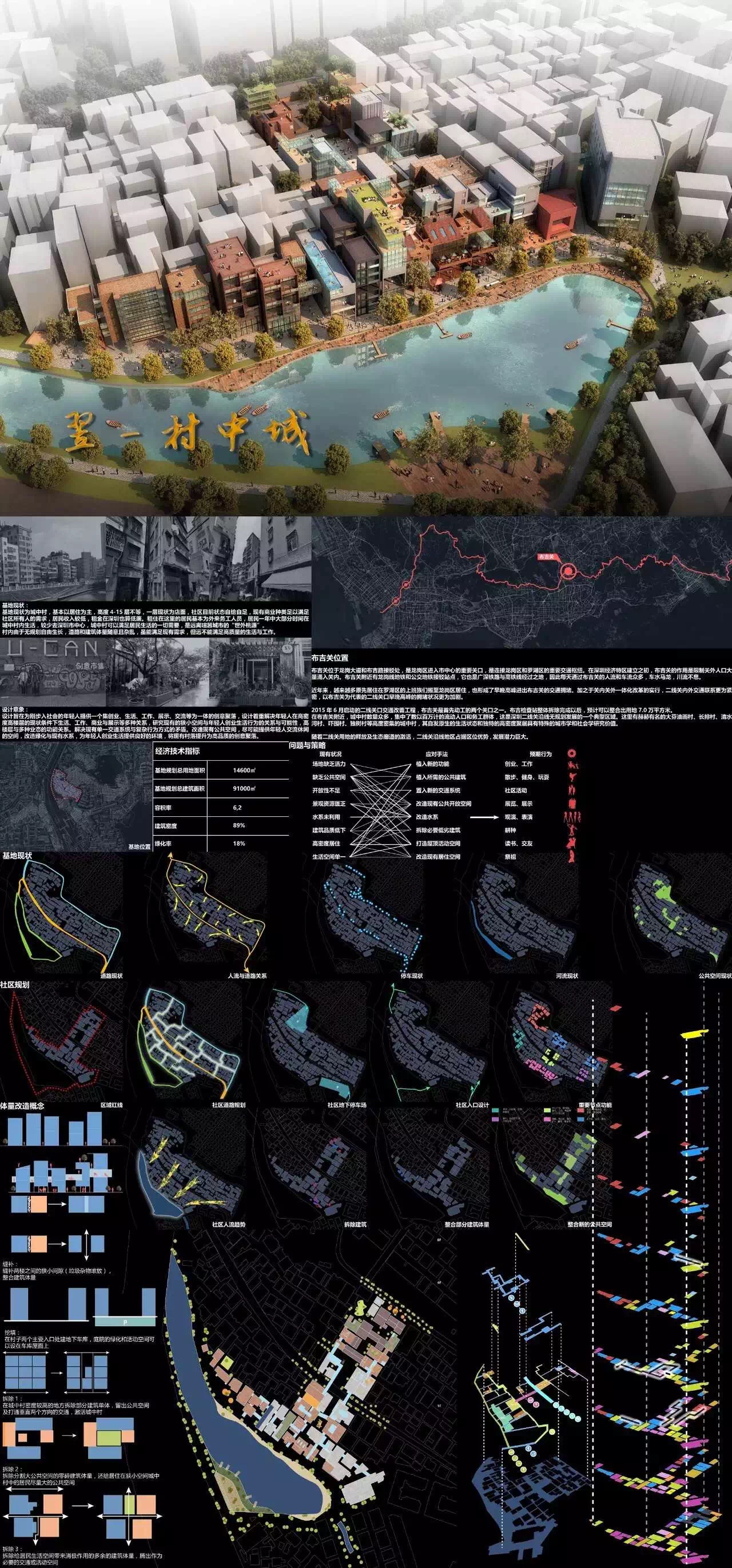设计选择深圳二线关布吉关片区城中村的城市更新作为课题,对其进行了深入调研和细致的分析。比较系统地提出了解决二线布吉关片区长期以来围绕居民的一系列问题的路径和方法。对深圳未来二线关区域的更新具有较强的现实意义和参考价值;设计还对其中的几个城中村节点提出了改造的详细实施方案,方案设计构思巧妙,具有较强的地域特征和现代气息,功能合理,较好地处理了与周边环境的关系,为布吉关周边居民提供了一个很有吸引力的公共活力和交往的场所,设计逻辑性强,表达清晰,结构布置合理,体现了作者具有很强的综合解决设计问题的能力和素养。