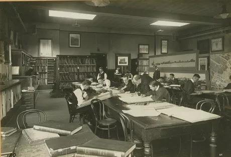 ▲海登楼内的建筑资料阅览室,前排右二为赫伯特·E·埃弗雷特(图片来源:宾大校档案馆提供)