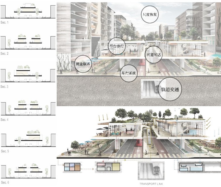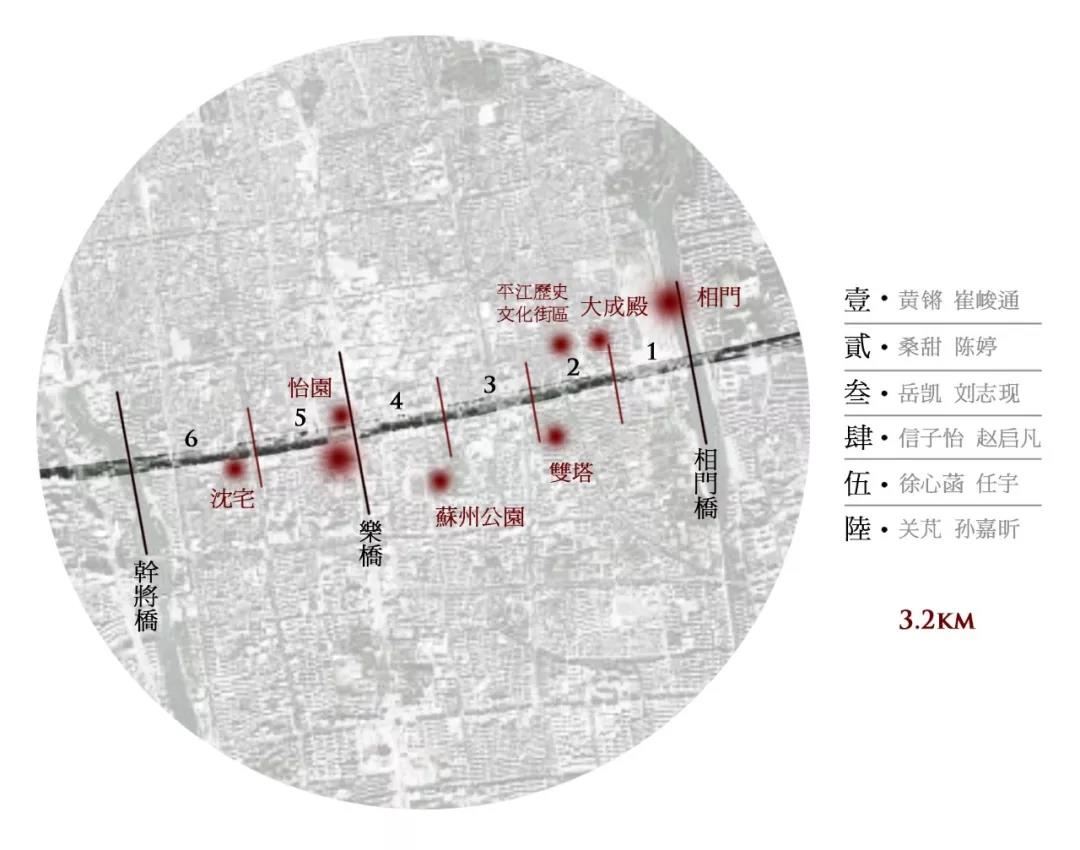 具体分配方式为:将全长3.2KM的苏州干将路古城区段,分为每部分400-600米不等的六段区域,每段根据场地周边既有要素,分主题进行重点设计。