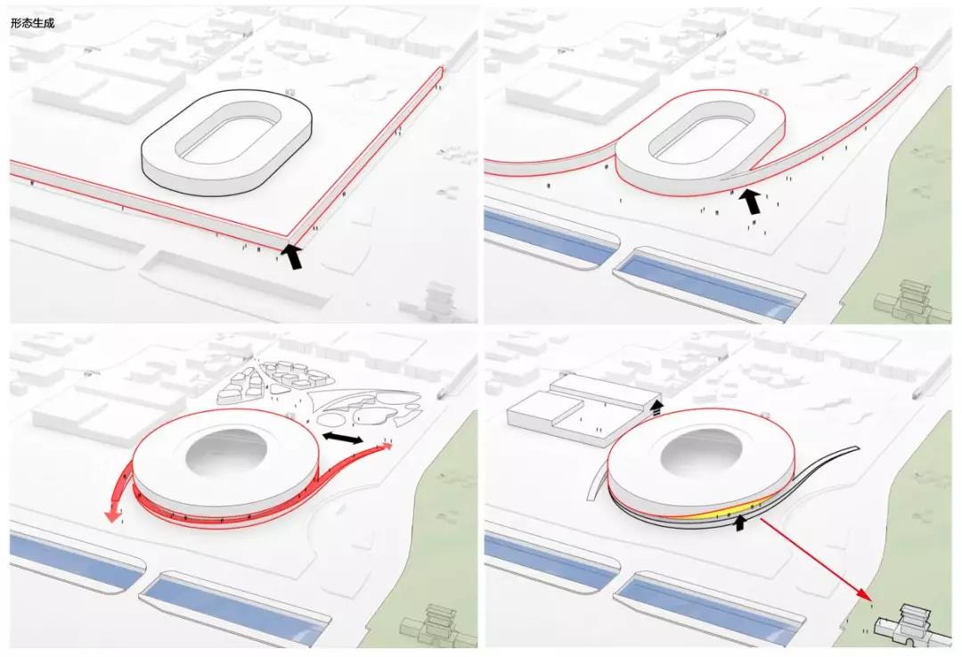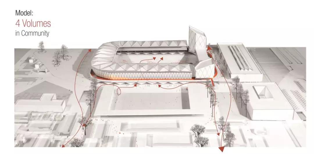 此方案重构场地业态,引入酒店及商业,并将原有体育培训馆的多种业态整合,与体育场南端合并行成体育商业综合体。体育场的平台层抬高到二层,行成环绕的跑道向市民开放。场地与场馆之间的综合利用,提出赛时与非赛时段的交叉使用,共同构筑体育综合社区中心。