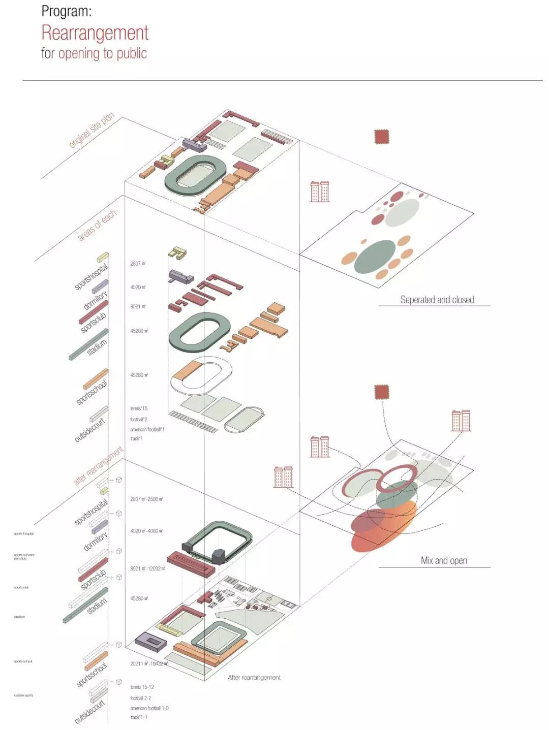 国务院于2016年6月23日在奥林匹克日印发了《全民健身计划(2016-2020年)》,为深化体育改革、发展群众体育做出部署。计划同时提出,到2020年体育消费总规模达到1.5万亿元。目前国内体育场馆多为单一的竞技体育用途及国家资助运营,场馆使用率低、维护运营成本高的情况一直未能得到改善。一方面是设计问题,缺乏科学规划及空间使用灵活性;另一方面是体育产业缺乏与市场紧密运作,职业联赛与商业运营的紧密结合。在城市快速扩张过程中,政府为了开发便捷、资源集中利用,往往倾向于在新城市的郊区建立大型奥体中心、集中场馆,而忽略了许多居于城市中心的田径体育场。这些体育场往往地理位置条件优越、交通便捷但设施老旧、商业配套缺乏,亟需根据城市空间规划进行重新定位,如改建成专业足球场或者体育商业综合体。此课题为AS建筑理论中心城市更新设计研究课题“激活系列”,将以多功能的产业需求为出发点,结合城市空间的改造升级,通过空间、结构和材料的一体化研究,探索城市中心原有体育场馆动态适应性改造的多种模式。
