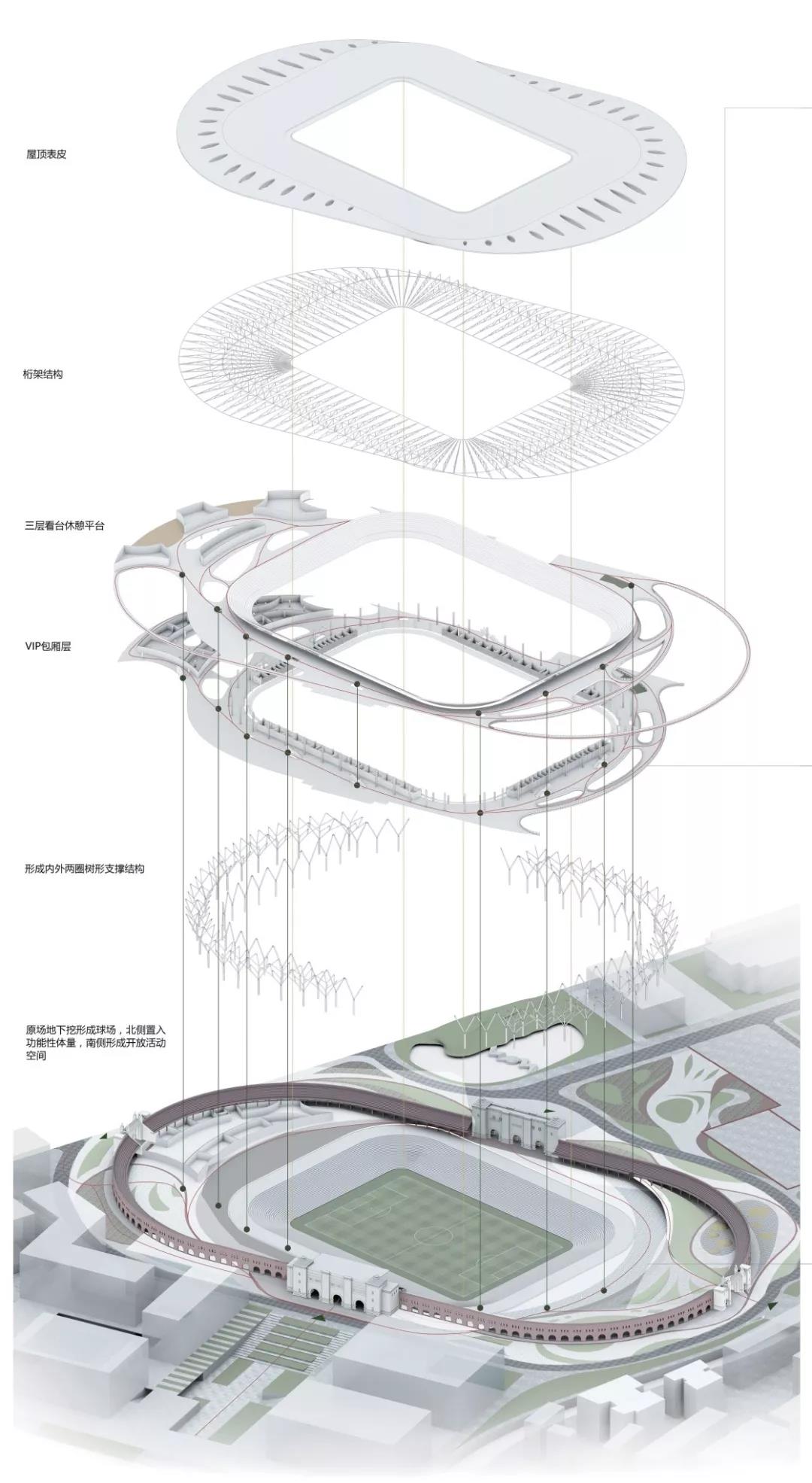 此提案采取的是传统的对待历史保护建筑态度:退让及轻盈。中心球场隐埋下挖,首层观众平进平出直接连接下层看台;整体将建筑体量对东西两端主立面的影响降到最低,从主入口下沉广场上仍能感受到伟岸的历史门楼。球场根据FIFA国际足联推荐的最佳球场角度扭转了15度,将首层原建筑回廊内外打通使南北各形成一个具有人流导向性的空间,向阳的南面形成开放的内庭院式城市公园,北面则嵌入一个小型商业综合体作为体育场的商业配套服务。当人们穿过旧砖墙的拱形连廊进入场地时,映入眼帘的是一个由树枝状的支撑结构托着的木质屋面,有种别有洞天、豁然开朗的感觉——原来这隐藏着一个城市的小绿洲。
