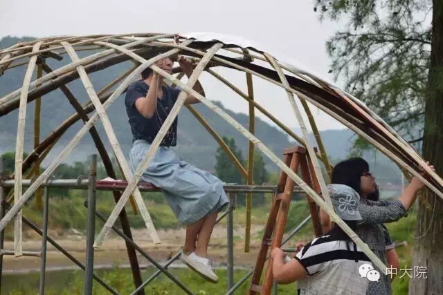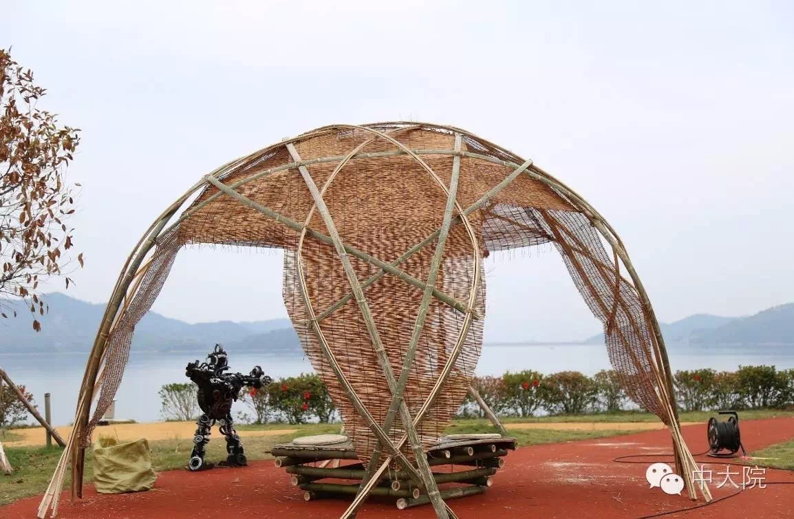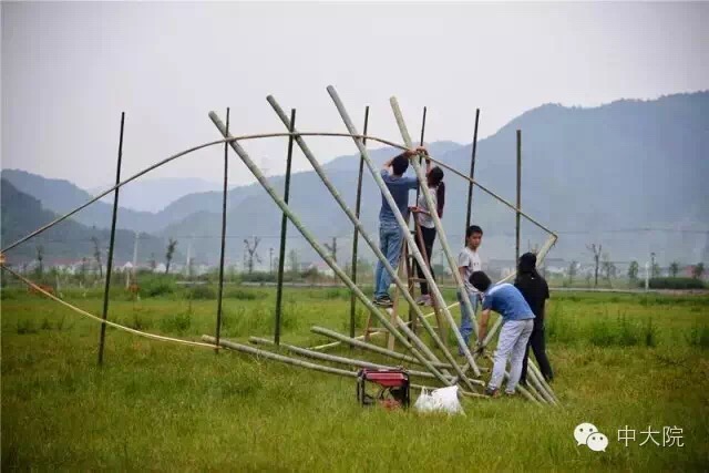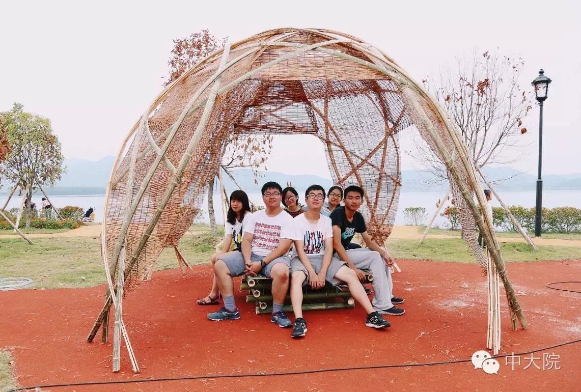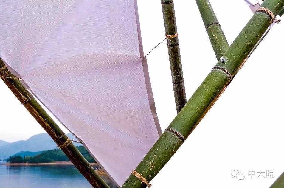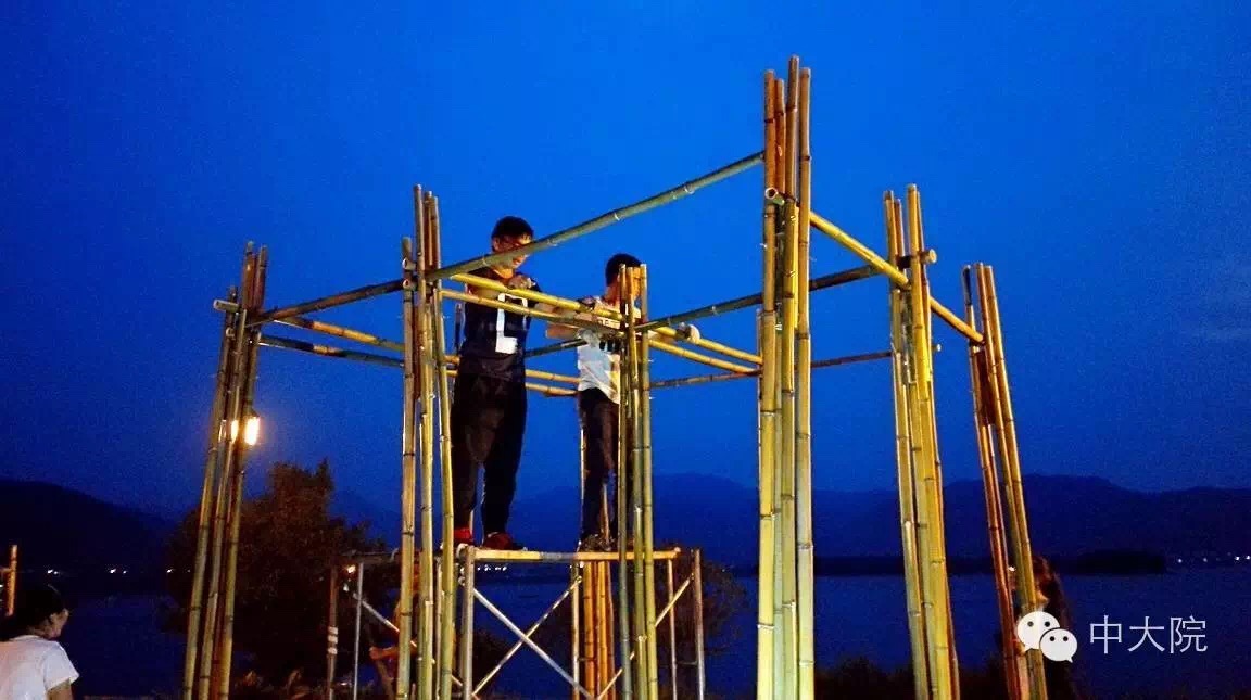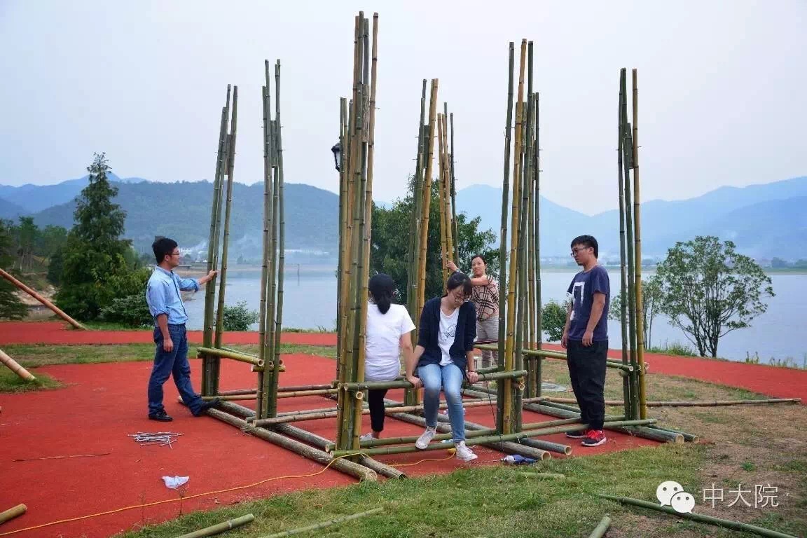 选择竹组的共32名同学。经过一年级设计基础课5周的训练,同学们对竹构作业已经驾轻就熟。在校园进行了一周多设计和准备工作之后,全体师生远赴浙江余姚市梁弄镇,在水光潋滟的四明湖畔展开了三天两夜的搭建活动。