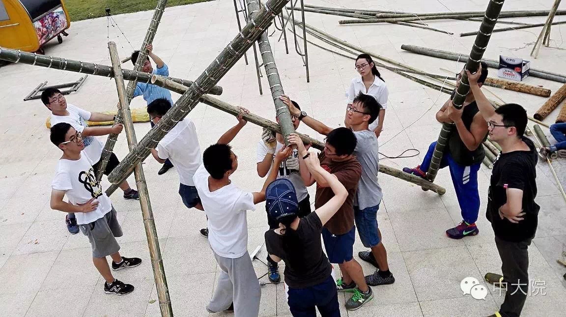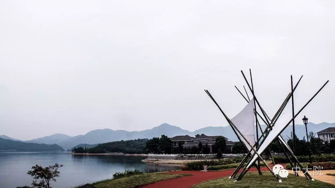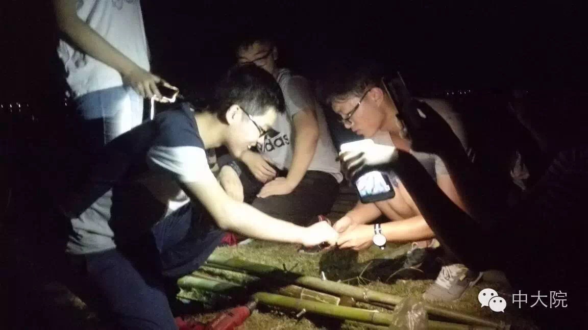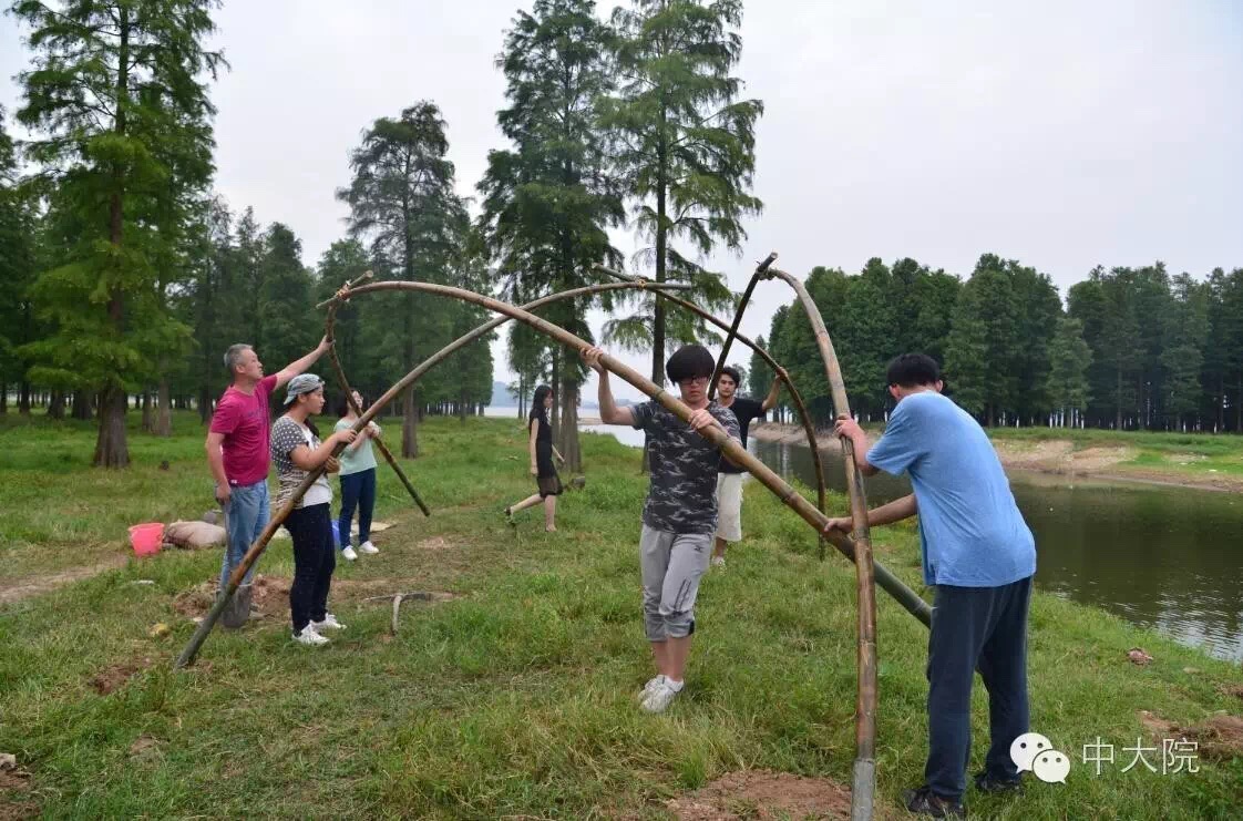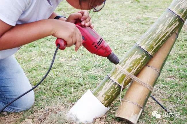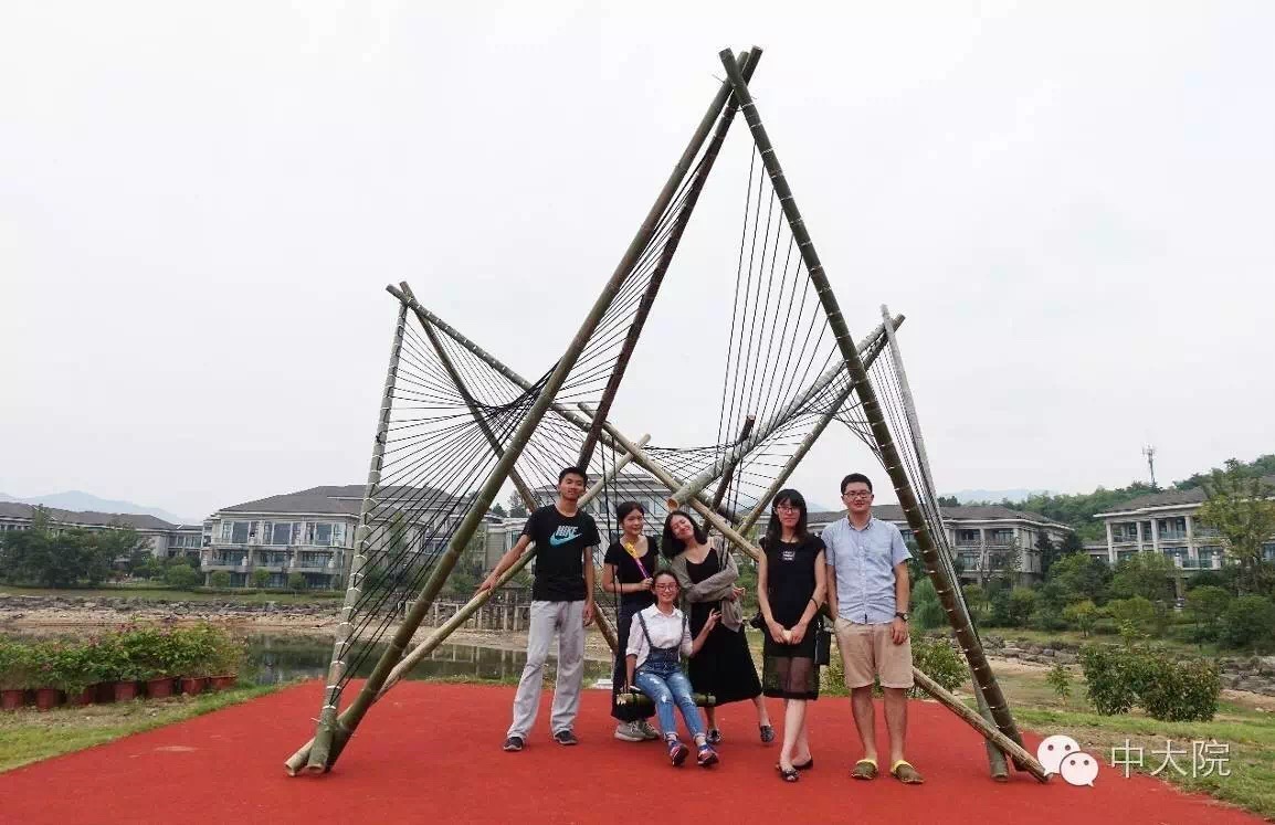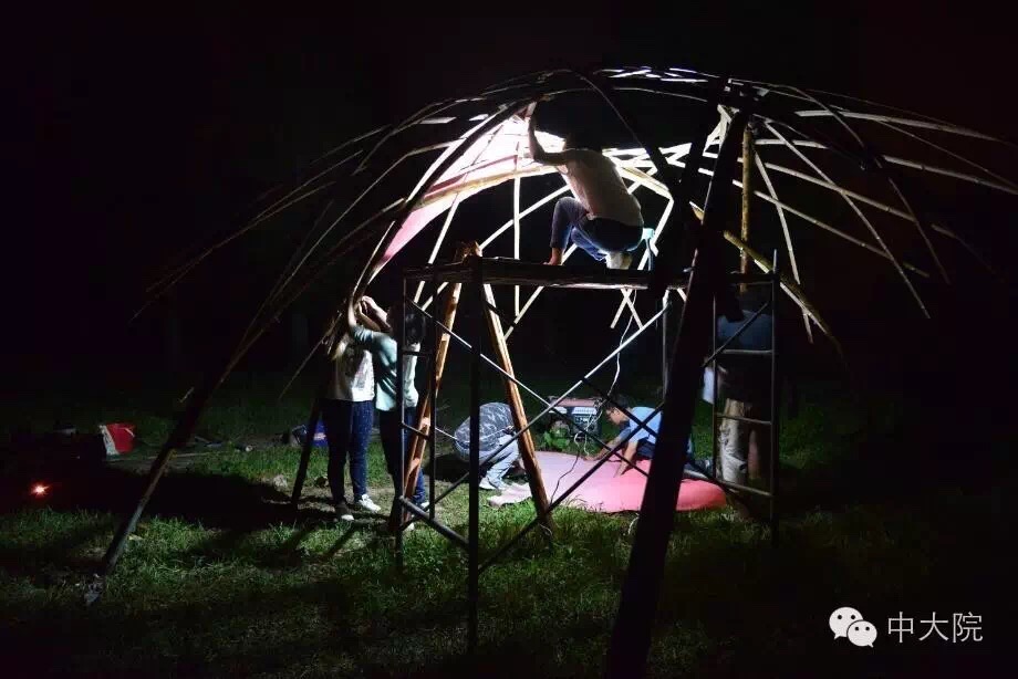 选择竹组的共32名同学。经过一年级设计基础课5周的训练,同学们对竹构作业已经驾轻就熟。在校园进行了一周多设计和准备工作之后,全体师生远赴浙江余姚市梁弄镇,在水光潋滟的四明湖畔展开了三天两夜的搭建活动。