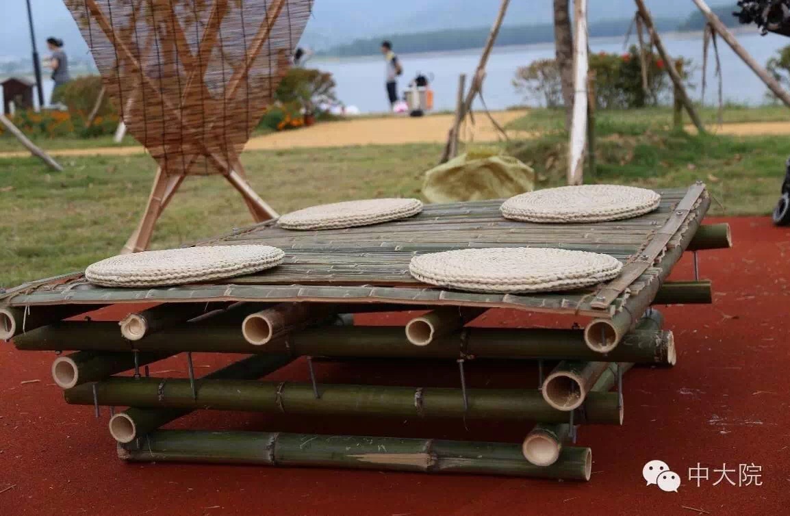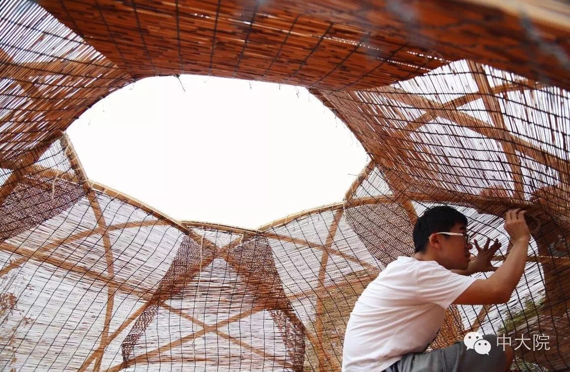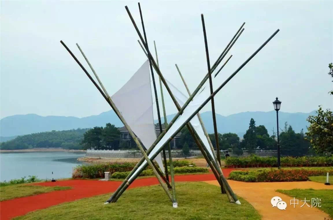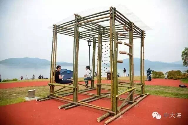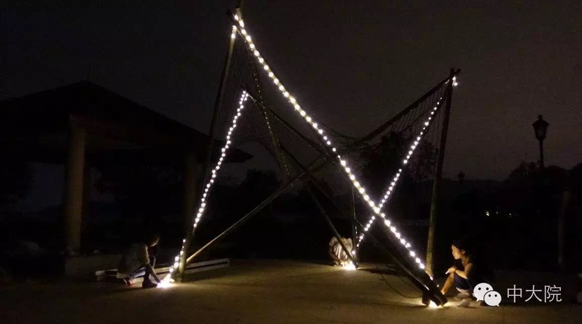 直竹竿构成的三角形单体和三根斜撑搭接而成。三个三角形单体在内相互支撑,斜撑在外稳定结构,结构十分坚固。最终斜撑和单体共同构成以六个三角形循环而成的构筑物。每组斜撑和单体其中一根杆之间以三十股麻绳规律相连,这既有助于稳定结构,增加反向力,同时麻绳形成的曲面又增加了美观度。利用麻绳和竹子这两个主要材料元素制作的秋千,悬挂在构筑物中心,成为了构筑物的趣味点。