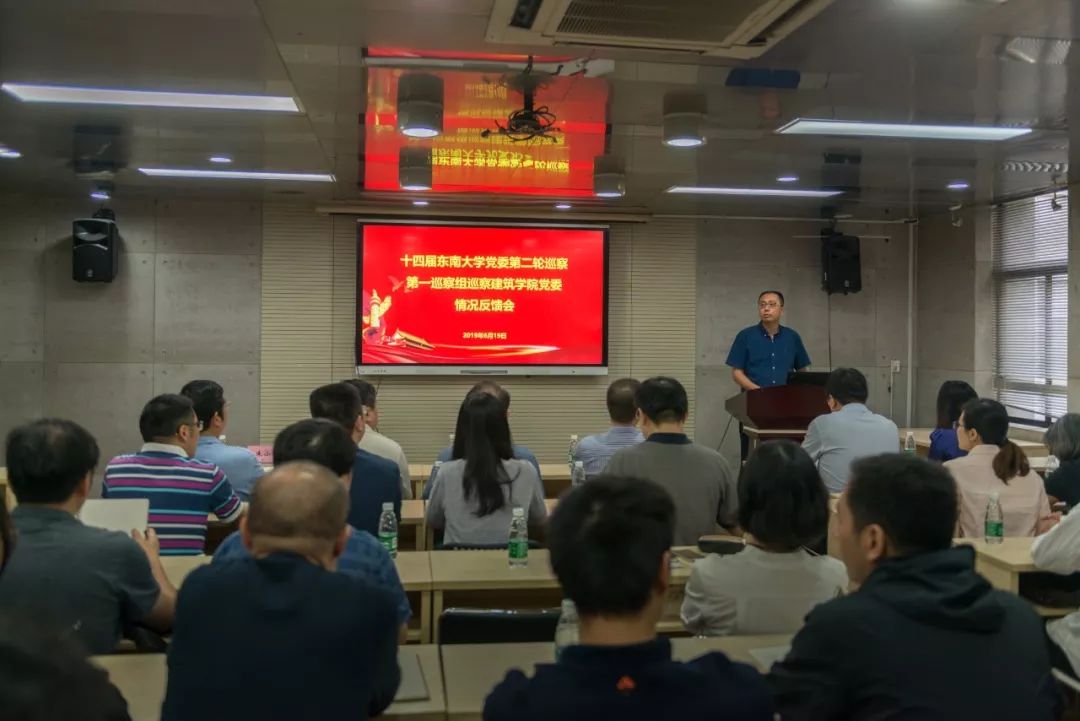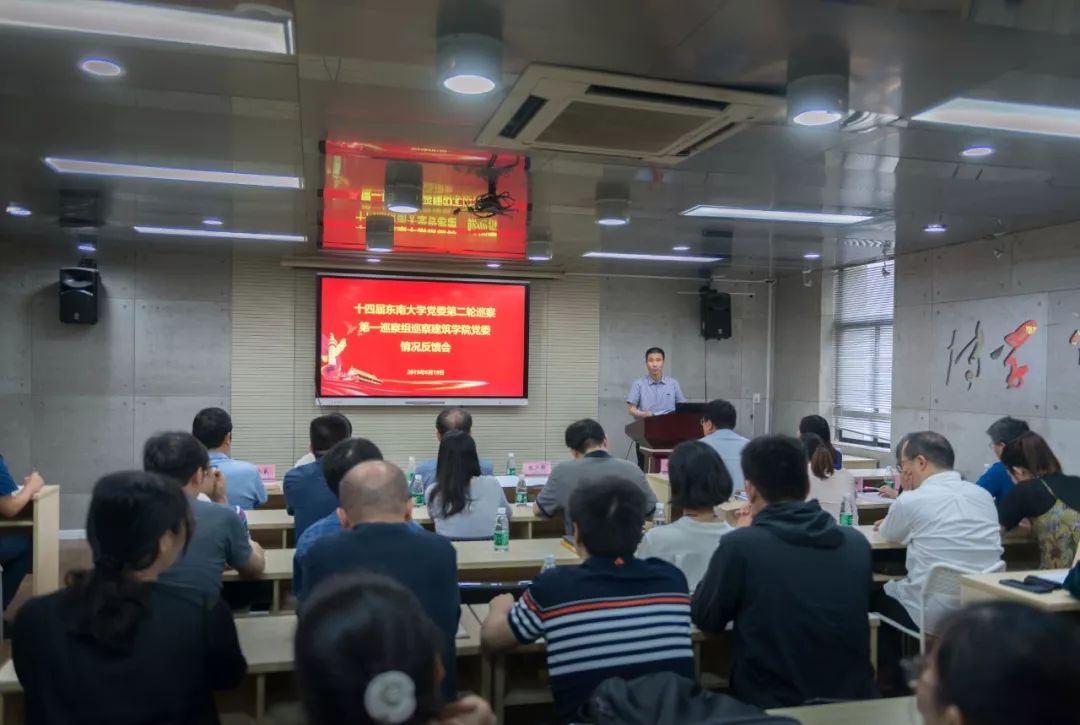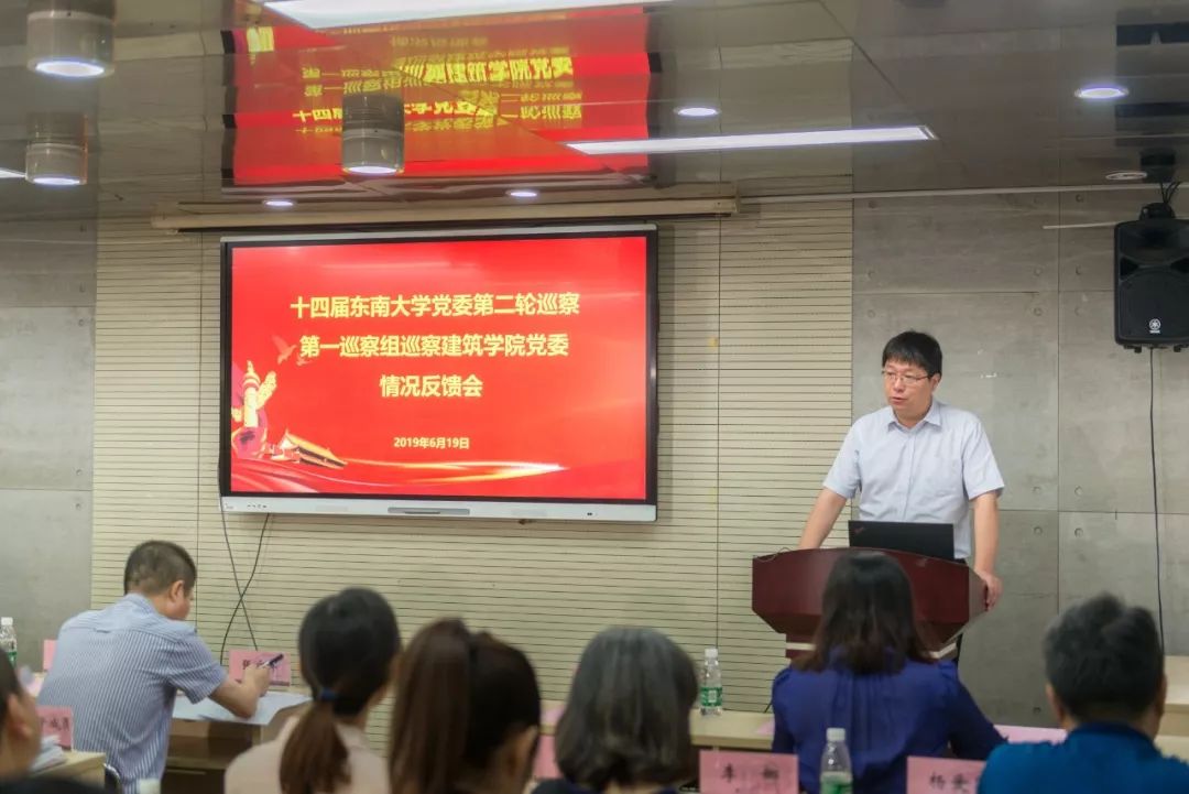 根据学校党委统一部署,十四届东南大学党委第二轮巡察第一巡察组于2019年4月10日至4月25日,在建筑学院开展了为期16天的巡察。6月19日,建筑学院巡察反馈会在四排牌楼校区中大院209召开。大会前,在113会议室召开了巡察反馈沟通会,东南大学校长张广军,党委巡察工作办公室主任吴荣顺,党委组织部常务副部长朱小良,第一巡察组组长施畅、副组长王绍灵和学院党政领导班子成员出席了会议。沟通会结束后,巡察组其他成员,党委委员,教师代表,离退休教职工代表和学生代表一同参加了巡察反馈大会,会议由孙世界副院长主持。