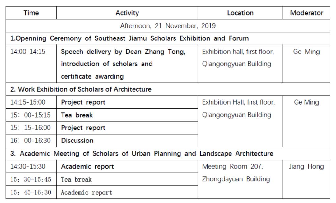 The first session of Southeast Jiamu Scholars Exhibition and Forum will be held at 14:00 on 21 November, 2019 in the first floor exhibition hall, Qiangongyuan Building, Sipailou Campus of SEU. Main participants of this forum will be SEU young alumni, among which 26 scholars (or in group) are invited guests who are outstanding in their individual field of Architecture (16 scholars or in group), Urban Planning (6 scholars) and Landscape Architecture(4 scholars). The exhibition and forum will provide a stage to display their works or academic achievements.