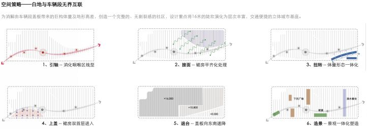 设计关注场地在城市中的位置,提出环融互通的概念,希望通过设计在产业上衔接周边,功能上成为城市活动交汇点,生态上与周边结合。迎街面上,通过退台式的商业以及结合地铁站设计,消解盖板带来的高差;办公以深圳的围屋结构为原型,将高大体量排在外围,营造内部的共享空间;城市公共建筑与生态轴线共同设计,提供场地的休憩和娱乐的空间,与周边环境连接,置入漫行步道,消除盖板高度的变化带来的影响,连接不同的分区。