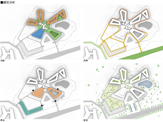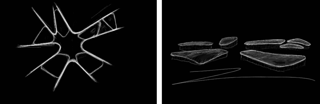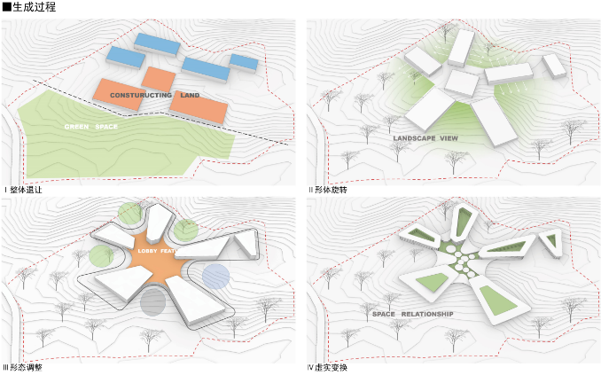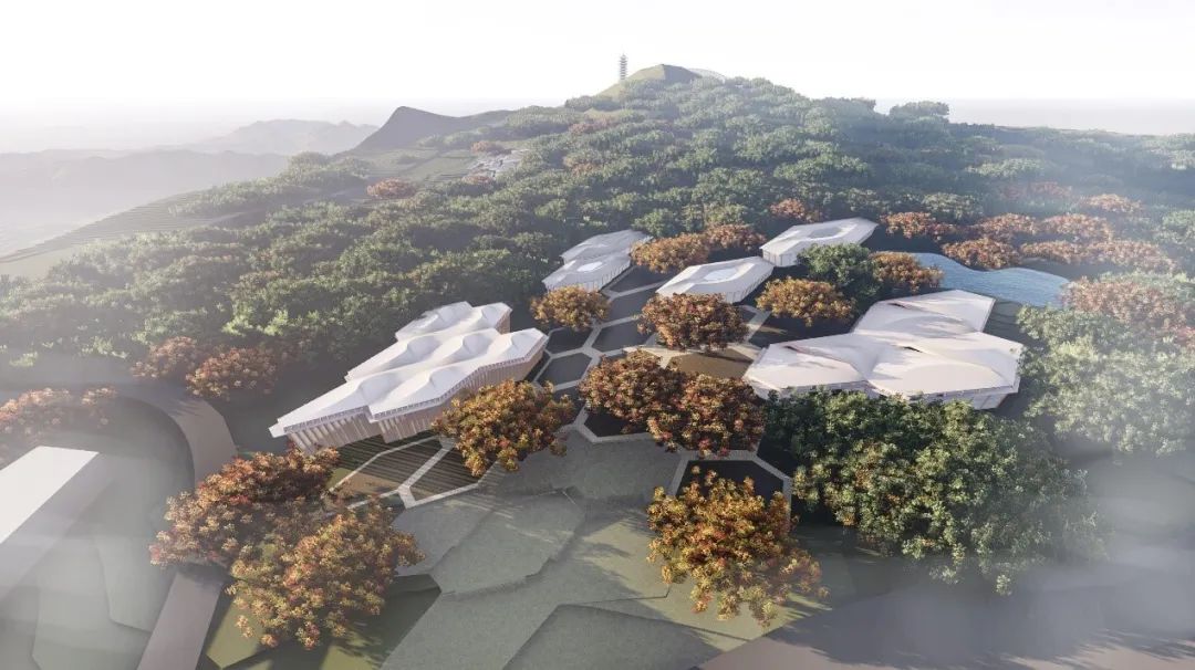 所以,带着这样的重新思考回归环境,从牛首烟岚中提取出“云雾”的概念原型,希望创造出“云深不知处,只在此山中”的居住氛围。而在后期深入过程中,逐渐发展出星状放射的布局和贴合地形的片状形态。这样,在面对周边文脉符号打开的同时,又能营造向心的共享空间,实现最近的服务距离,提高了酒店的整体效率。