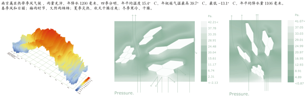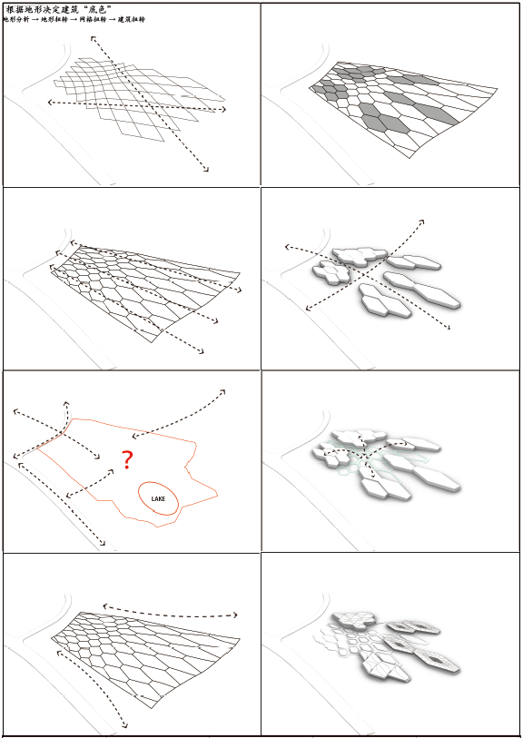 现代技术驱动下的牛首山东麓禅修酒店设计。本设计目标是运用现代技术分析的方法来突出酒店的在地性特点。通过对酒店实地调研,分析山地肌理,对山地进行计算机生成模拟,将地形网格化,并根据地形进行网格扭转;分析一年十二个月中温度、湿度、风向、雨水等气候条件进行场地网格的筛选,进而形成建筑形态。在现代技术分析的设计手法下,也考虑到了建筑功能、人的行为活动及景观等方面,希望可以突破传统形式,创新出一个现代化禅修酒店的设计思路。