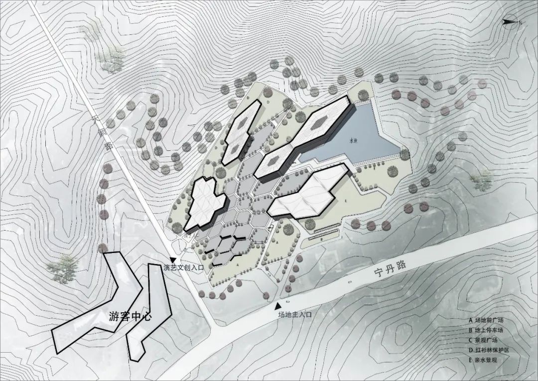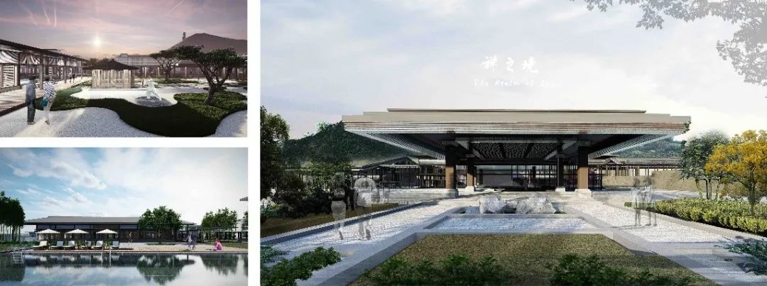 以化整为零的设计手法于牛首山景区东入口、游客中心北侧处规划设计了禅修酒店,设计和考虑与周边山体地貌和游客中心的关系,以及西高东低、北高南低的场地地形,形成大堂开敞居中、公区集中布置、客房区院落成组的整体布局,强调建筑与环境的融合以及行走路线与景观的视景互动。规划层面以依山就势为构思,由动态的公共领域逐渐过渡到静态的私密空间,建筑体量随地形逐级上升;建筑层面以师法自然为构思,灵感来自牛首山的灵秀山水,酒店起伏的天际线为山,引入水系作景观镜池,山水相映;细部层面以清雅自然为构思,建筑风格简洁而沉静,出挑檐口,材料融入自然,在日常中感受佛法。