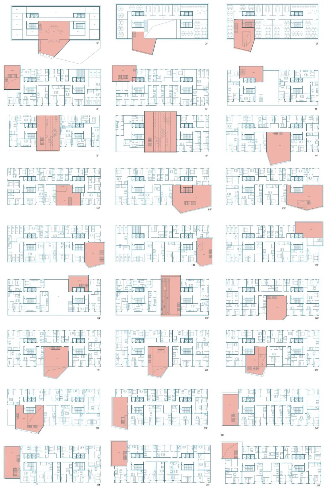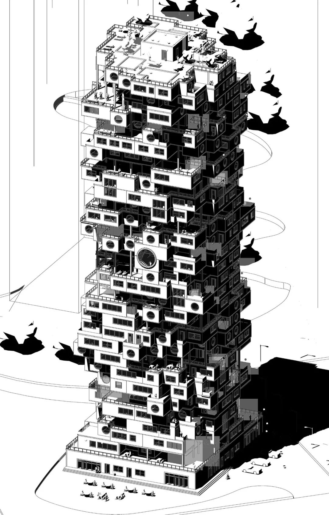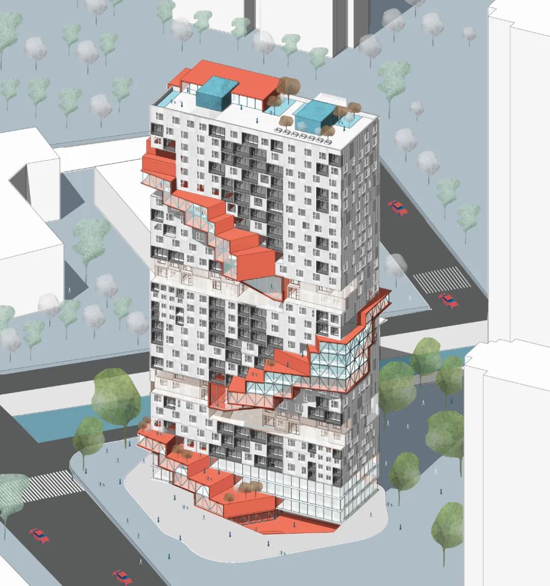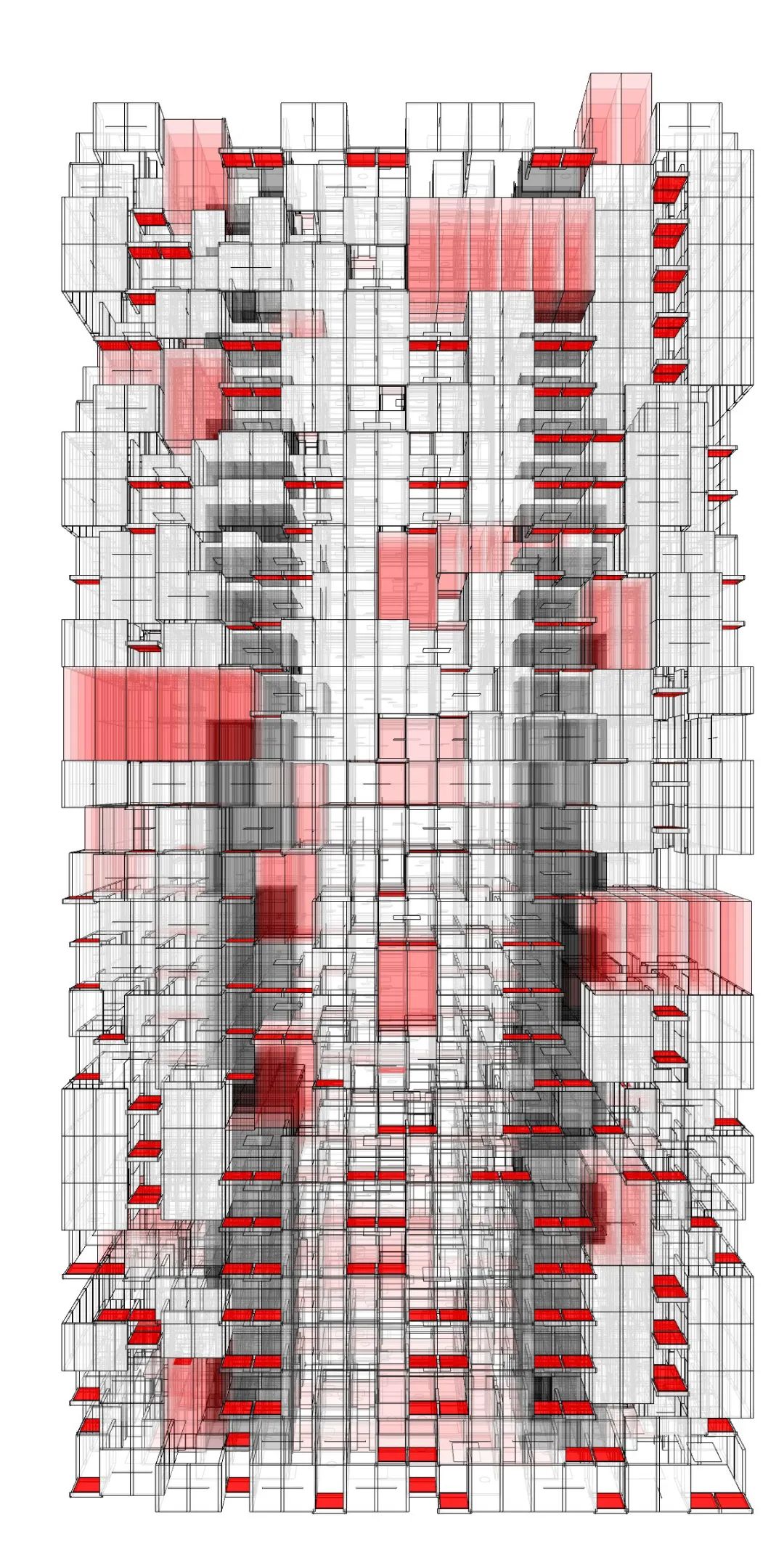 该方案将公共空间打造成富有活力的垂直街道,形成一条螺旋上升的公共廊道,其中设有放映室、开放客厅、健身房、便利店、阅读空间等等。公共空间在局部贯穿楼层,楼面形成折板,提高空间的趣味性和利用效率。ACROSS THE LAYER公寓内的户型十分丰富性,可以适应不同人生阶段和经济水平的住户需求。除单人间和家庭间外,还安排了舒适的家庭跃层和层高较低的合租户型。将设计好的户型用整数规划(由Gurobi实现)满铺在建筑中,限制条件为:户型不出界、不重叠、每户均接到走廊、每种户型在整个建筑中至少出现一定次数。
