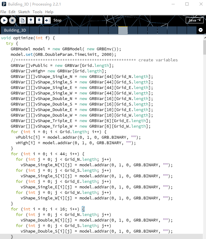 在Processing编程环境中调用Gurobi优化器实现空间布局的自动化生成