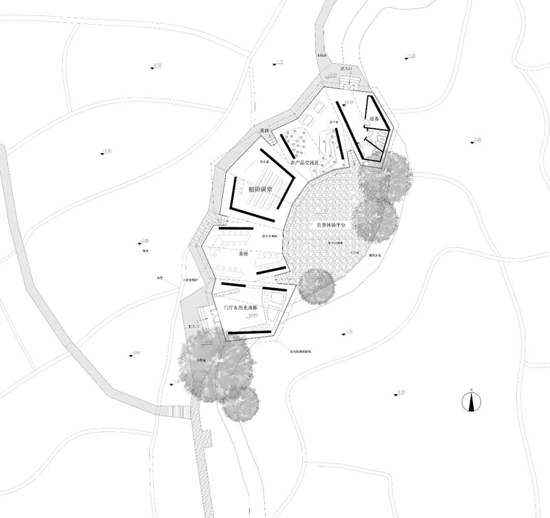 场地位于马源稻田中心位置,设计以“垄”为概念起点,提炼现状田垄肌理,将其梳理与整合,交织汇聚生成建筑形态。优化后的田垄高低错落,以当地土石铺就,保证稻田课堂功能使用的同时,也形成连接研学、交流、活动等各区块的田间游径。围护墙体以毛石砌筑,自周边向课堂中心逐渐隆起,尺度暗合空间高度之需与游走体验之便,综合架构出新的建筑地形。