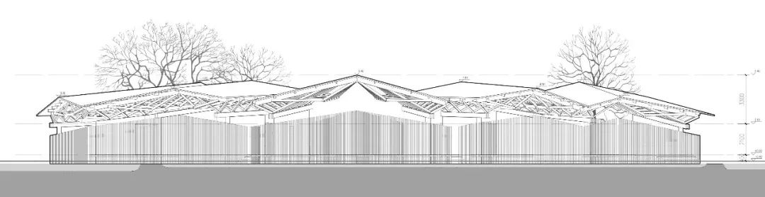 场地环竹林相抱,北侧为村庄竹加工厂,为方案竹构表皮提供在地依托。建筑表皮由竹节母题横纵编织、密制串联,从靠近山体的200mm单元间距渐变至靠近道路600mm单元间距,对应着内部空间由私密幽静至公共开放过渡,为适应局部空间采光通风需求,因地制宜地对立面开敞度进行精细化调整,在竹林起伏中若隐若现。文人好竹,研习于竹隐山房,体验竹影闪动与自然魅力。