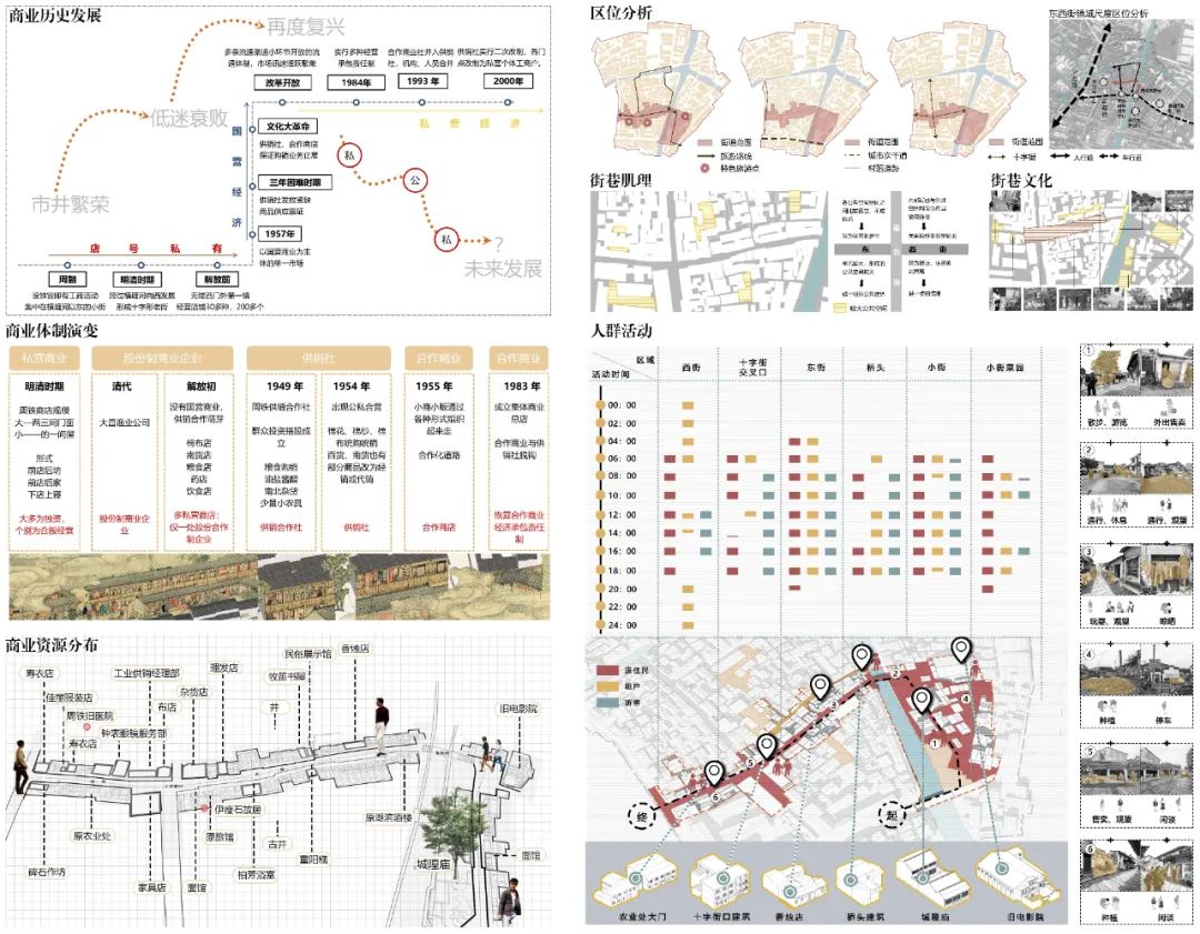 东西街是周铁传统村落十字街的重要结构,历史上一直作为村落的商业、公共活动核心地带。设计者首先对东西街的基本区位状况、街巷肌理特点、人群活动特点进行分析,初步判定东西街基本物质空间特色、人群活动特色;进而通过对商业历史发展、商业体制演变、商业资源分布的调研总结,凸出东西街商业特色。