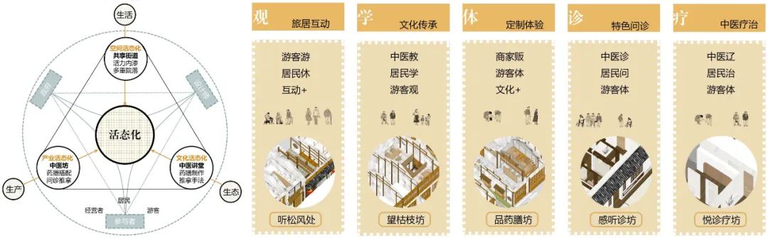 在三生视角下,通过空间活态化、产业活态化、文化活态化三大策略,探索建筑层级的生活、生产、生态的活态化保护利用机制。通过打造共享街道,激发建筑活力;植入中医观、学、体、诊、疗的新功能,增加体验式商业,以实现居旅互动,文化传承。同时对建筑的物理性能进行了相应改善。
