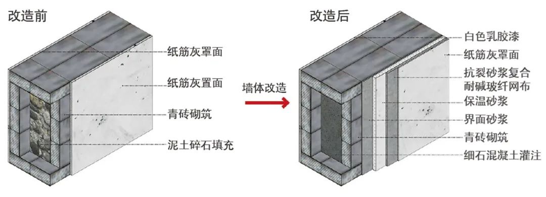 其次,对建筑的保温隔热性能进行了提升优化,对建筑的墙体、屋面结构进行适应性改造,通过屋面、墙体保温构造层的设计,可使改造后的建筑围护结构基本满足现代居住建筑的节能要求,改善了既有建筑的隔热保温性能(图9、10)。