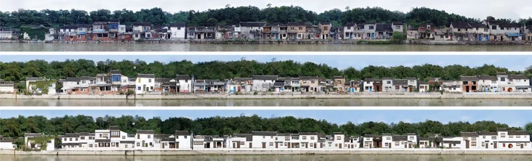 ▲5蠡河东岸2015年立面实景局部(上);蠡河东岸2020年立面实景局部(中);蠡河东岸风貌引导设计图局部(下)