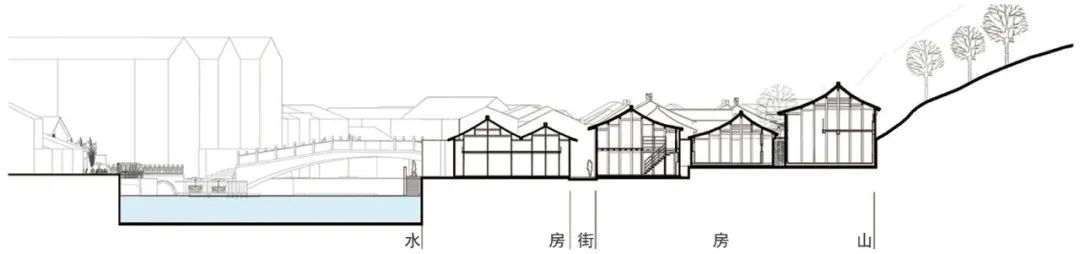 宜兴是中国历史文化名城,位于丁蜀镇的蜀山古南街历史文化街区是其重要组成部分,也是江苏省第一批历史文化街区,其范围包含蜀山局部、南街、西街和东街,其中的蜀山龙窑窑址为全国重点文物保护单位。古南街东依蜀山,西临蠡河,背山面水,地形高低错落,整个街区呈现“河绕山转、街随山走、河街并行”的空间格局和“水-房-街-房-山”的典型剖面关系(图1~3),是宜兴现存最为完整的明清古街道。古南街原长近千米,现约400m,宽2.4~3.4m,路面全为长1.4m的整块花岗岩条石铺砌,条石下为街道的下水道。靠蜀山一侧的建筑为小面宽、大进深并与山体等高线垂直,一般临街为居住或商铺,面阔不超过三间,纵深方向沿山体拾级而上通向蜀山中的龙窑;建筑之间每隔一段就有一处上山通道,是居民活动与紫砂器上下搬运的交通空间,同时起到防火间隔的作用。靠蠡河一侧的建筑,也是窄长的多进院落,临街面或居住、或店铺,临河每隔一段有河埠头或者小的公共空间形成错落有致的驳岸。街道建筑多为1~2层砖木结构的商业店面,面阔一般不超过三间。建筑因街道走势呈东西向布局,主入口面向主街,风貌形态保存基本完好,具有原真性、完整性、依山傍水生活生产一体化的独特性。