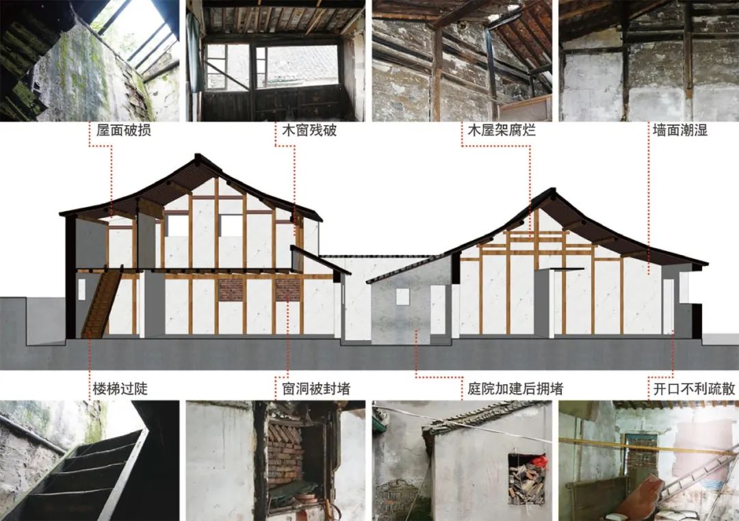 改造过程中,首先对原有的建筑性能和结构状况进行踏勘测绘和分析(图8),研制出针对张家老宅“联体-共生”结构的建筑加固补强技术措施,包括加强整体性的轻体加固结构的方法和防止连续倒塌柱间加固结构及方法,确保了保护改造的安全和三开间日后改造的整体性。