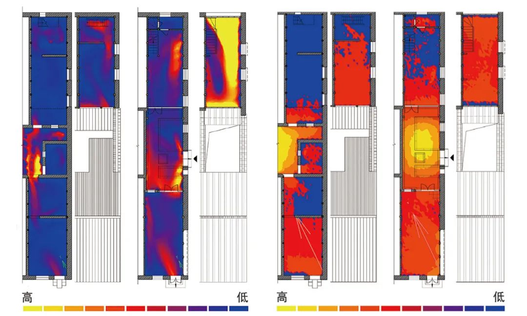 ▲12/13改造前(左)后(右)通风条件模拟/改造前(左)后(右)采光条件模拟