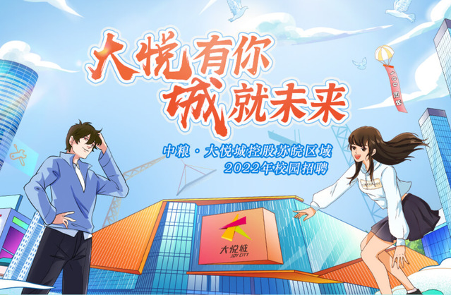 大悦有你,成就未来 — 中粮·大悦城控股苏皖区域2022届校园招聘火热启动!央企担当,实力不凡!商业管理、市场营销、规划设计、财务行政等多个岗位等你挑选,投递链接:http://campus.51job.com/grandjoynj2022。
