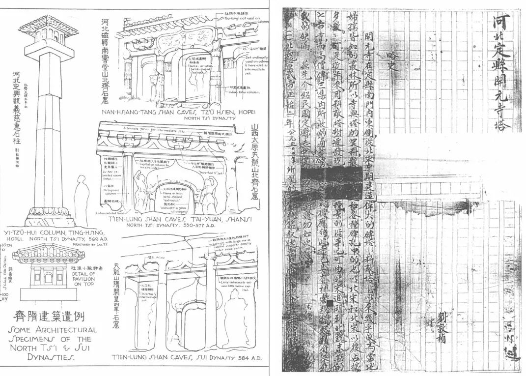 左图:刘敦桢先生古建测绘图稿,齐隋建筑遗例。右图:刘敦桢先生《河北定县开元寺塔》调研报告手迹。