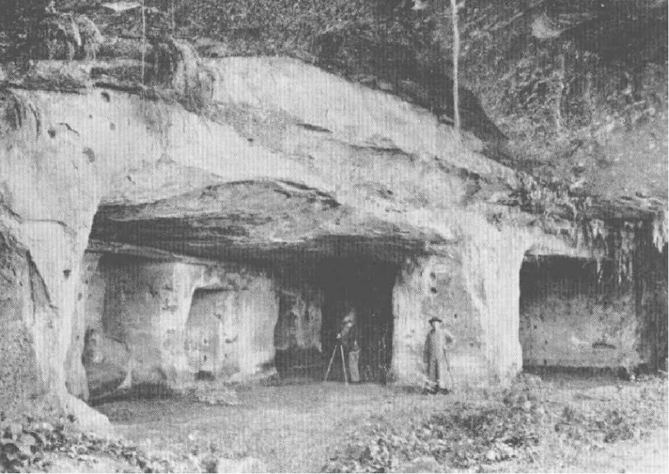 刘敦桢先生(右一)与梁思成先生(右二)考察乐山县白崖山东汉崖墓,1939年10月31日。