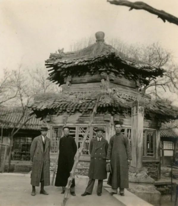 刘敦桢先生(右一)与杨廷宝先生(右二)等,为修缮北平古建勘察现场,1935年。