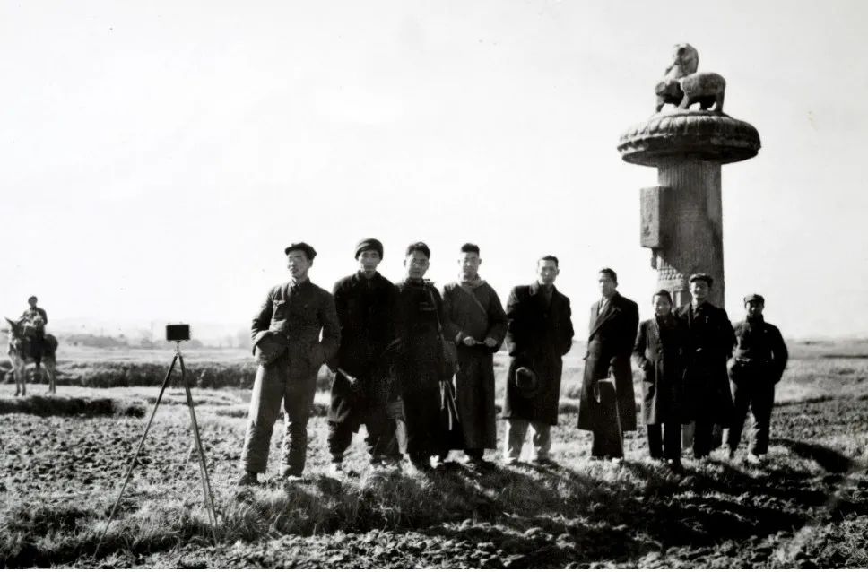 在营造学社于1946年停止活动后,刘敦桢先生持续推动中国传统建筑调查与研究工作。图为刘敦桢先生(左五)与南京市文管会专家调研梁吴平侯萧景墓前,1950年2月。