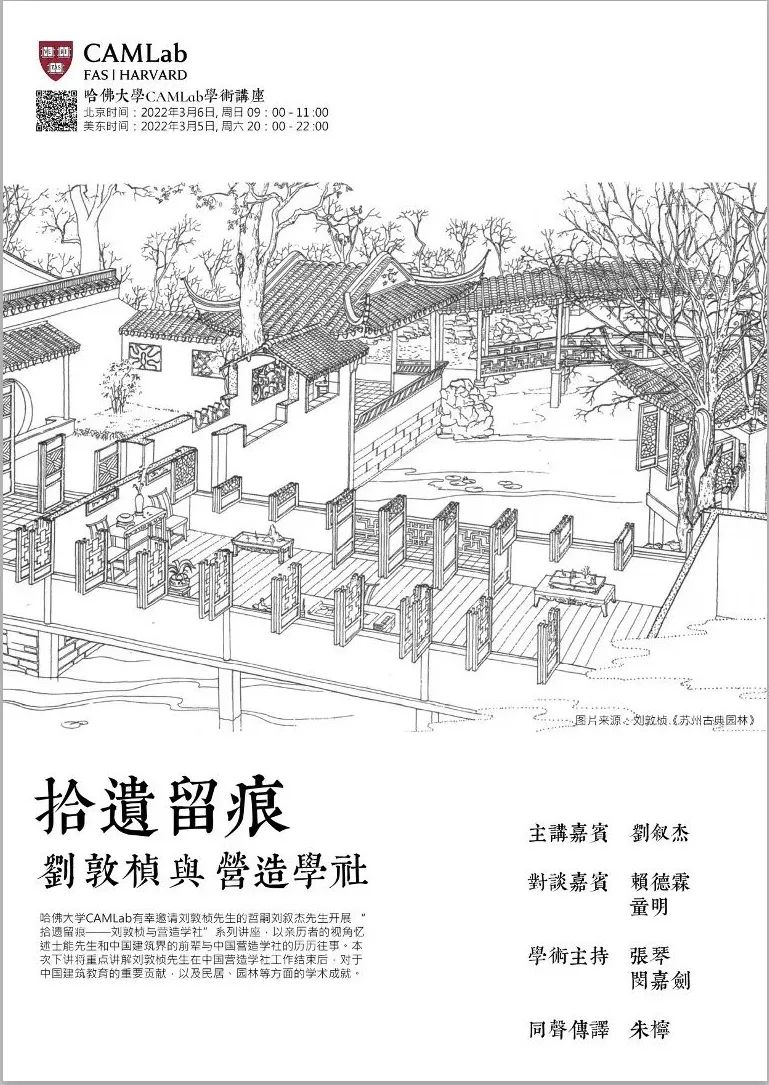 2022年初,在哈佛大学中国艺术实验室(CAMLab)的组织下,教授、刘敦桢先生哲嗣刘叙杰先生,连续开设三次线上系列讲座,以“拾遗留痕——刘敦桢与营造学社”为题,从亲历者与建筑历史学者的视角,忆述刘敦桢先生与中国营造学社的历历往事。