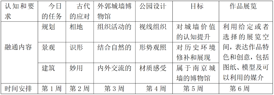 首先,我们需要理解的是开展此教学探索的背景。一是从思维的宽广角度加强建筑相关的教育和培养是一条根本的路径,这是从杨廷宝先生一生的体悟中以及他丰富的实践成果背后可以明了的主要认知;二是将历史作为一种思维方式来学习古人或者前辈创造的经典建筑和设计智慧及思想,是一条探索中国建筑传承与创新的道路,三十余年前,东南大学建筑史教学首创“意向设计”以打通历史与设计教学的隔阂,二十余年前又持续探索,本阶段三个一级学科在历史环境或者历史议题下进行的融通设计是具有挑战性的教学改革3.0升级版;三是经过三个一级学科建筑学、城乡规划、风景园林独立分野(2011年)十年后的反思,有必要对于学科之间的融通有深层的回归和新的期盼,这也是中国当代建筑研究下探索实现新的突破的可能路径。其次,我们必要认知中国古代建筑史上的人类建筑和人居环境营造,在人工和自然相结合、谋局和建筑相互动、室内外环境相协调方面,甚至在当代建筑作品中,几乎没有当下的学科界限,但是却有卓越的成就,这是我们可以授课的内容,也是在建筑历史与理论基础平台上设置融通设计的前提。因此,为配合这门设计课,我们讲授了中国古代城市建设、景观与建筑营造在大尺度、中尺度、小尺度方面互为表里、互为因借、因地制宜方面的思想和原则、尺度和感受、材料和标准以及在保护和发展之间古人的做法与选择。此外,我们还组织设计老师对当代西方建筑设计中注重地貌景观、历史环境、文化习俗、地方特征的作品进行案例分析,从而架构起古今和中外在认知上的桥梁,诸如:相地、视野、彰显/体察地势环境,了解历史格局,明确立意;识形、补形、强势/辨识文脉地形、借助自然和建筑等要素、增强整体感;巧用、组织、序列/组织利用规划结构和观览序列、体验历史环境和氛围等,这样为融通设计的知识交融建立了基本认识。再则,就是在教学的程序上,如何集中在每周2次共5或者6周的课时下有效地开展融通设计。在学生分组上,基本是不同学科同学构成小组,老师的组织是2位来自不同学科的老师指导一大组(包括4小组),历史和景观老师由于人数少,有时参与某大组指导,有时巡回在几个大组之间进行指导。在教学研究上,每周老师均会课前或者课后集中备课,研讨相关问题,及时调整交叉涉及的关键矛盾或者寻找契机。此融通教学的根本目的就是改变常规的从规划到设计、从形态到形体、从外部到内部的分离设计,实现跨学科融通设计的目标:1)网状的设计思维培养;2)合作协同的工作方式;3)师生互动的方法探寻;4)整体大于局部之和的教学效果。以南京外郭城墙博物馆及公园设计为例,对于每周的安排如下(表1),可以发现不同学科的交融学习和设计组织、工作重点及其完成的目标实现过程。表1