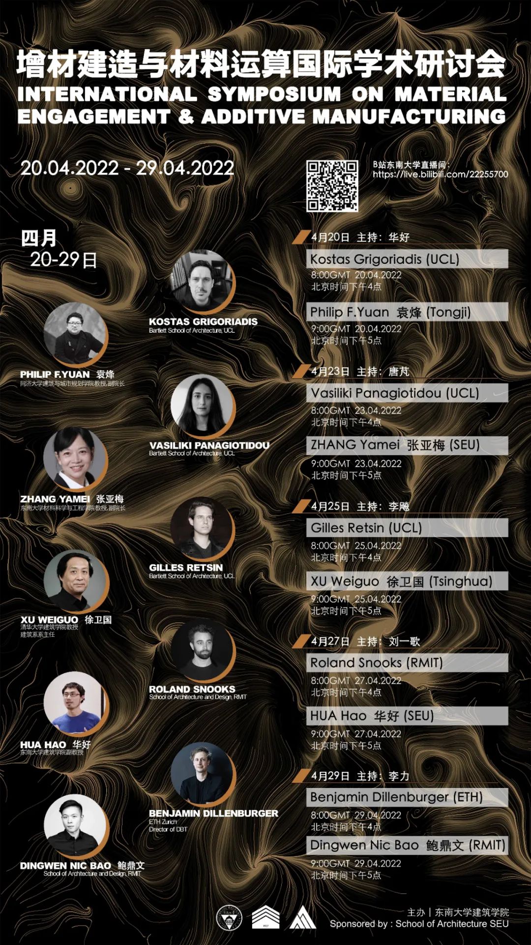 数字技术前沿学术讲座自2020年以来,由与苏黎世联邦理工学院(ETH)建筑技术研究所联合发起,与全球多所高校与事务所的学者共同组织,逐渐扩展为一个全球性的运算化设计与数字建造的学术平台,重点关注数字设计与建造的理论方法、技术应用、教学与人才培养。2022年是该系列活动的第3年,10位演讲嘉宾来自于在数字建造领域领先的6所国内外高校。会议主题为“增材建造与材料运算”(Material Engagement & Additive Manufacturing),深入研讨增材制造、3D打印、拓扑优化、材料运算等新兴技术与方法,展现增材建造及其材料应用的国际前沿发展趋势。