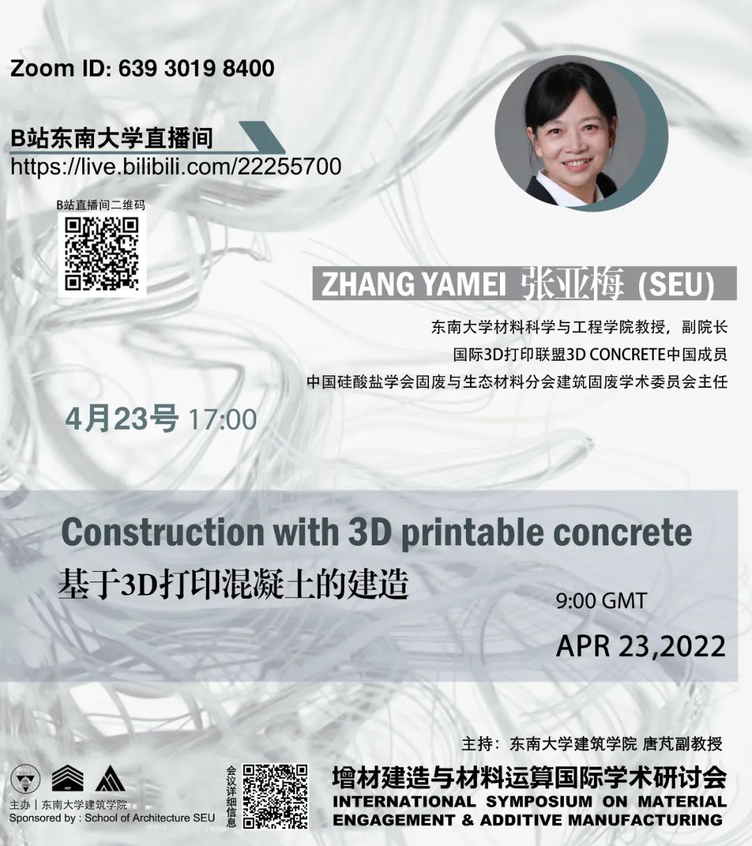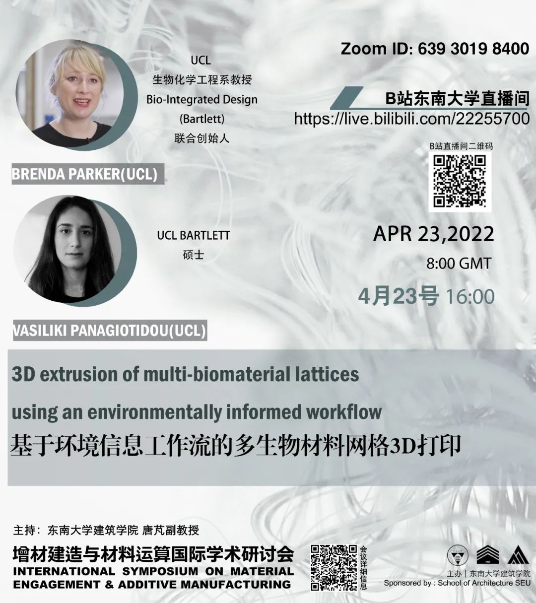 “增材建造与材料运算”国际学术研讨会第二场将于4月23日下午4点-6点在线上举行,英国伦敦大学学院(UCL)的Brenda Parker教授和Vasiliki Panagiotidou与东南大学材料科学与工程学院的张亚梅教授将分享她们在3D打印跨学科领域的最近研究成果。