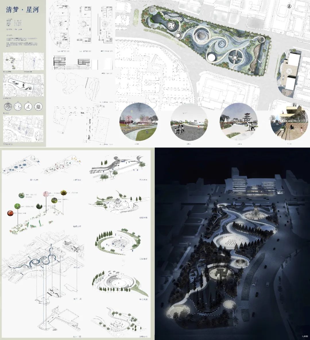 结合山水人文历史环境的底蕴、地铁轨道站点的交通特性,思考基地在当下城市发展中的特色和定位,进行兼具历史人文和绿色发展理念的公共空间设计。保护历史文化资源,发挥历史文化遗产的社会教育作用和使用价值,在历史环境中塑造面向未来的公共空间;对接地铁交通、构建慢行网络、设置绿色交通设施是减轻交通移动碳源的重要方式;优化绿地格局、适宜植林率等是增加自然碳汇的重要方式;通过城市三维空间营建,提高城市空间利用效率,基于景观连续性优化建筑与城市空间形态。特色意图——高密度城市环境中的绿色开放空间、“内秦淮河水系—北极阁山体—玄武湖公园”历史环境和生态系统的重要节点;功能策划——承载市民各种交往休闲活动、文化展示、景观体验、交通换乘等公共功能;交通组织——促进低碳交通,解决好两条线路的轨道交通、公交巴士和步行、公共自行车的换乘;景观组织——与文保单位原国民政府考试院旧址、武庙遗址和钟楼等的景观协调,与周边鸡鸣寺樱花道等景观路径的衔接;