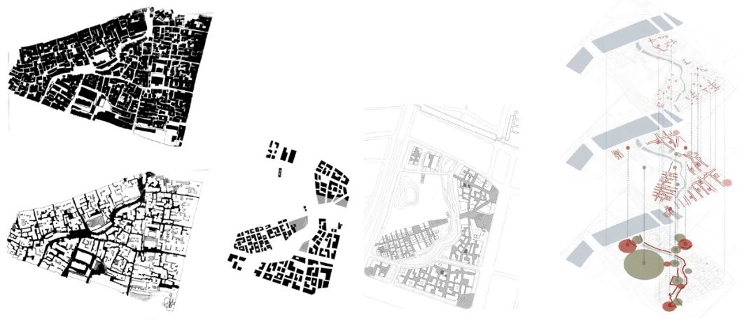 从教学的层面,融通教学从课题研讨到付诸实施经历了较为漫长的过程,其中探讨的核心内容在于对西街这样一个作为城市中不断演化的复杂地块,在诸多的历史信息与物质空间信息中判断其中的“变”与“不变”,大报恩寺空间格局所奠定的基本空间结构形成了对西街地块及周边的控制性要素,而周边地块的阶段性发展产生了不同时期的空间应变。从这一核心问题出发,对于此类复杂地块中 “源流”策略的产生至关重要,也体现了融通教学的基本目标。