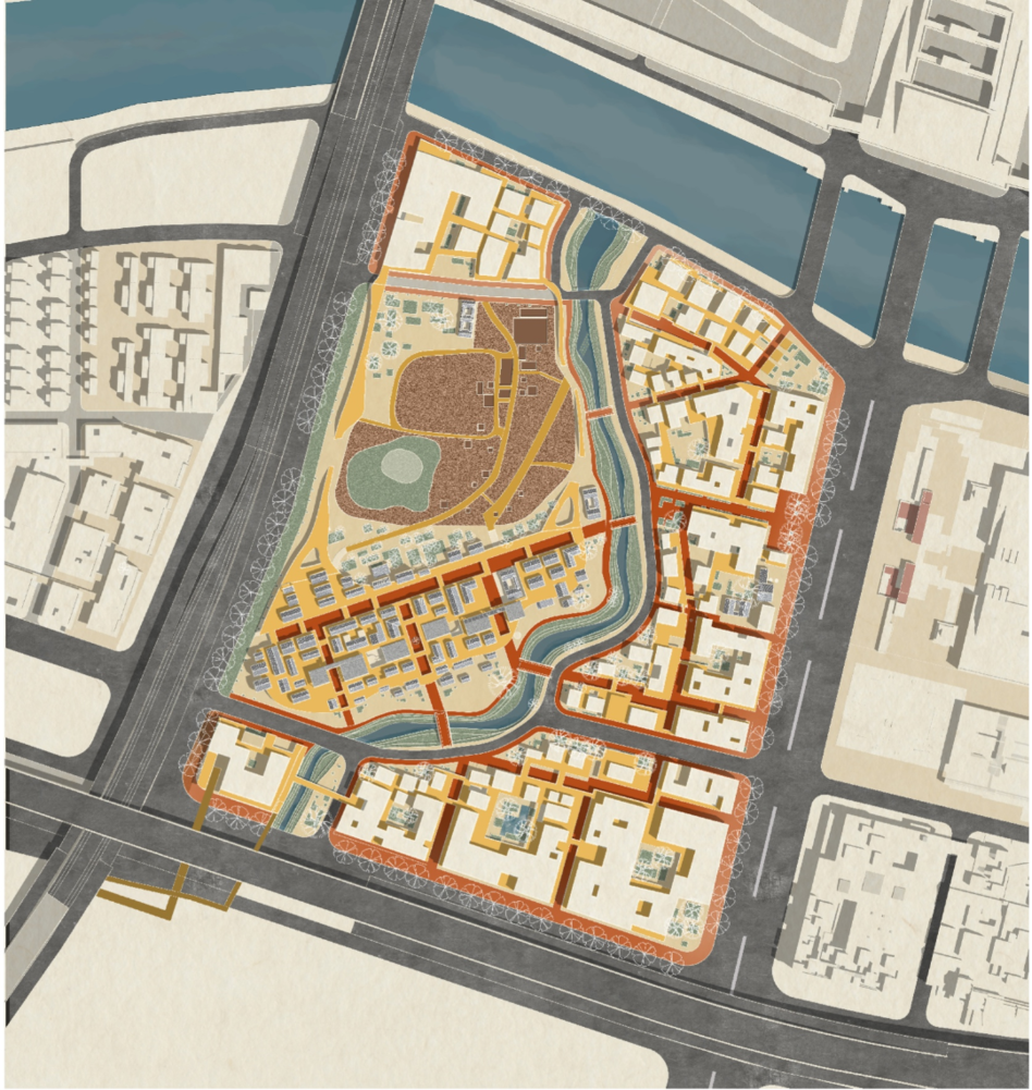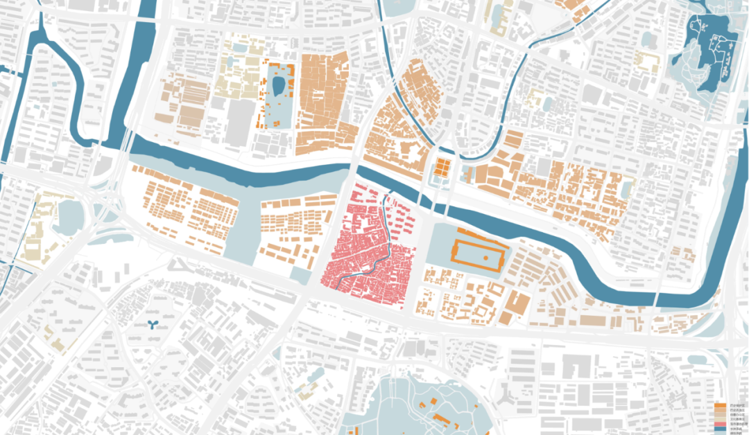 图1设计场地及周边的肌理拼贴(红色区域为西街地块)