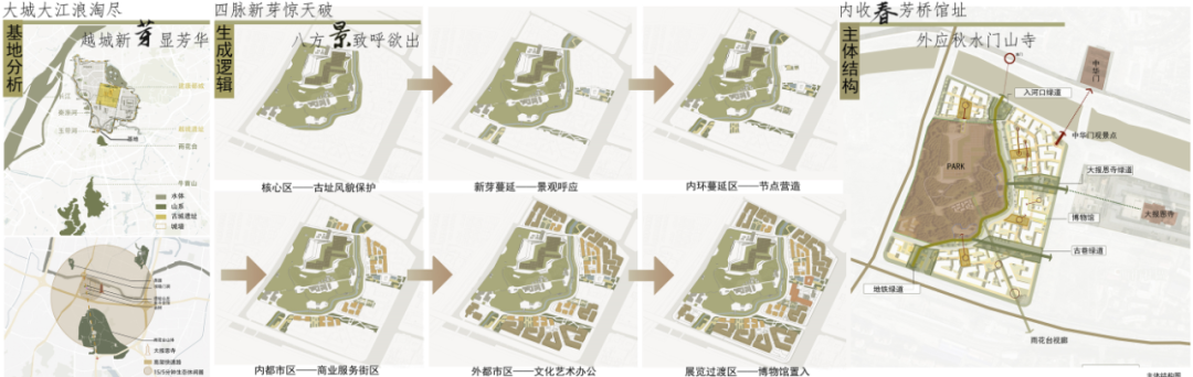 课题希望通过将设计操作与周边地理自然信息、建成环境信息,以及历史文化信息的多重结合,以各专业学生小组合作方式,提出越城遗址地段的整体设计;并在此基础上,结合各专业的具体要求深化城市系统研究、完成越城遗址博物馆的建筑单体设计和越城遗址公园的景观设计。